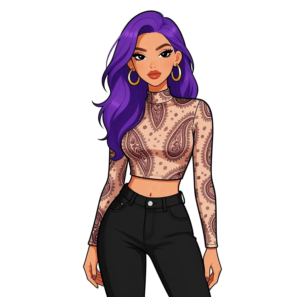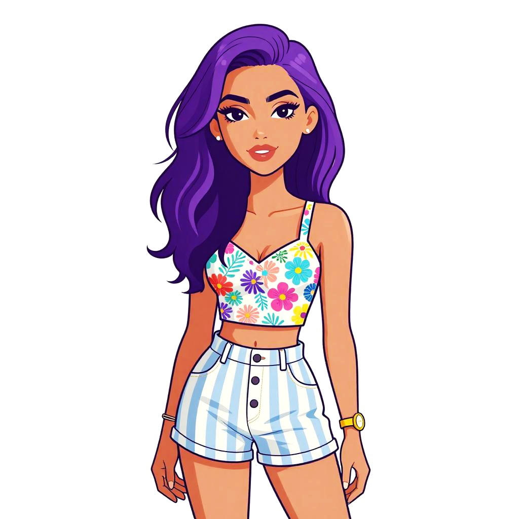Woman with pretty face and pretty hair. Woman, bohemian casual, sleeveless white blouse with lace detailing and embroidery, deep v-neck, lightweight fabric, olive green shorts with frayed hem, layered delicate chain necklaces, minimal makeup, simple hairstyle, plain white studio background. --sref 1467