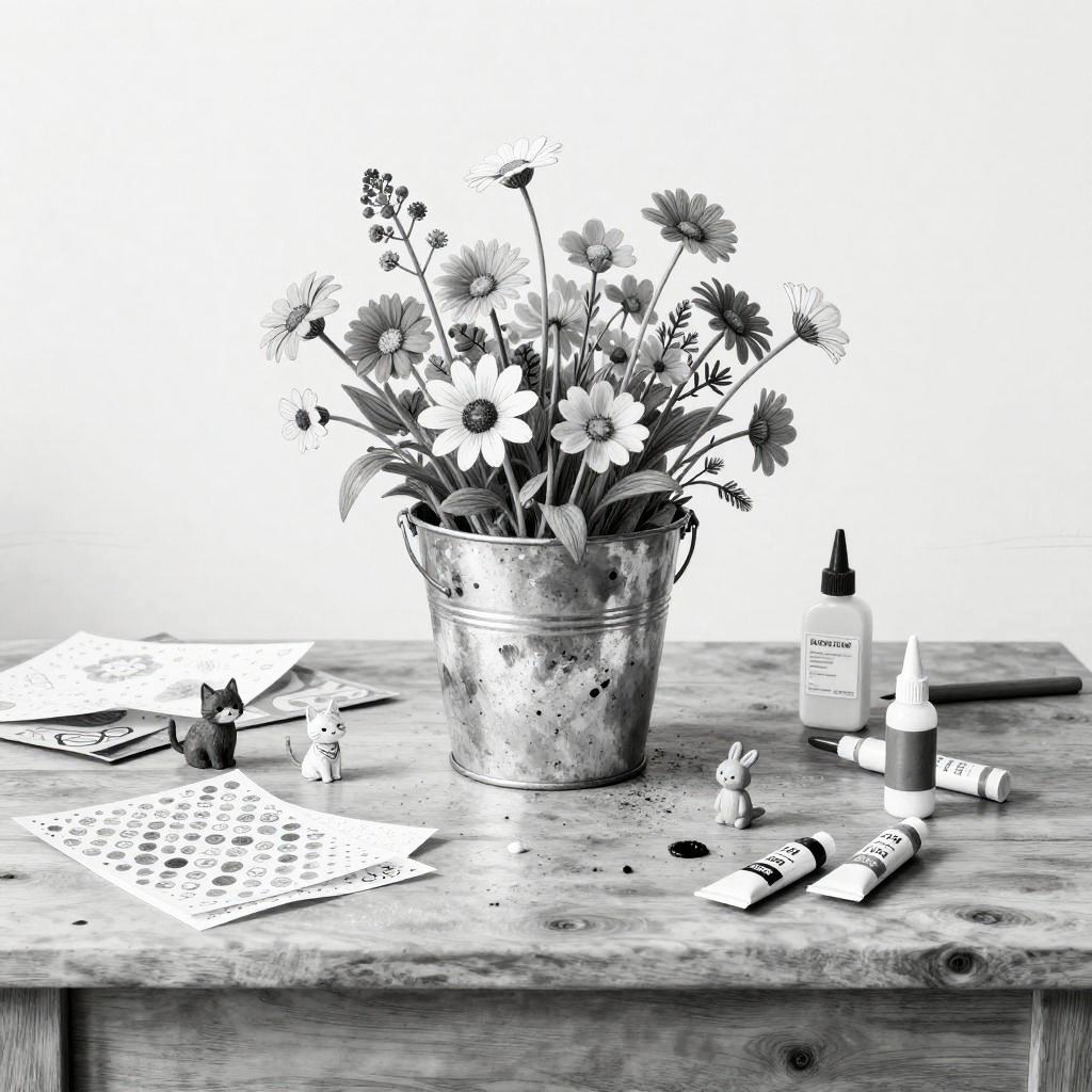 Black-and-white, whimsical hand-drawn still life on a wooden craft room table, centered on paint-splattered tin bucket with colorful wildflowers. Arranged around it: scraps of patterned paper, glue bottles, paint tubes. Tiny figurines of a cat and a rabbit add charm. Background is minimal, a few lines suggesting a wall and horizon. Soft shading, gentle crosshatching, delicate line art, balanced negative space, subtle paper grain, calm studio light, sketchbook aesthetic.