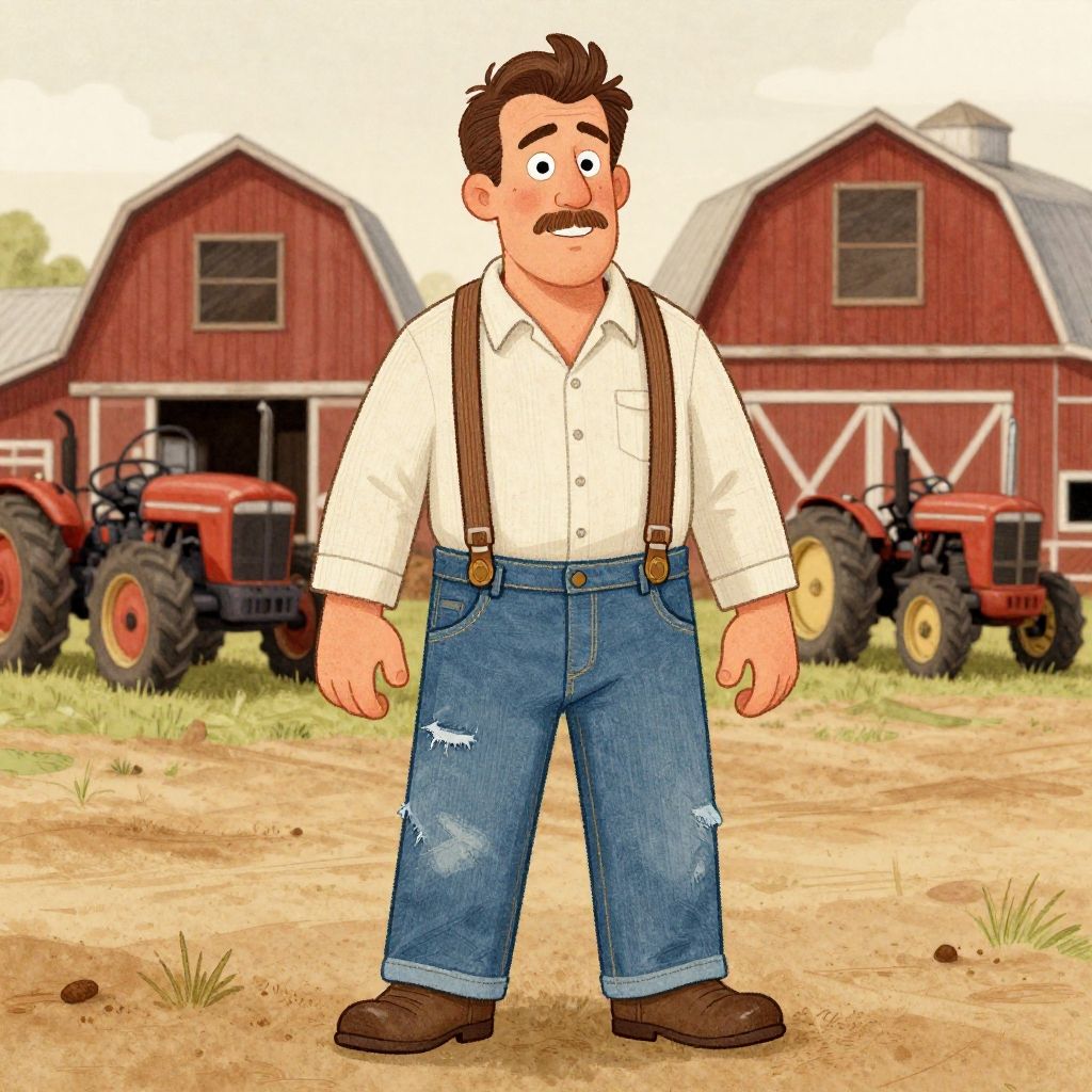Cartoon-style drawing of a cheerful, chubby man with black glasses, white shirt, blue overalls, and brown suspenders, standing on a dirt