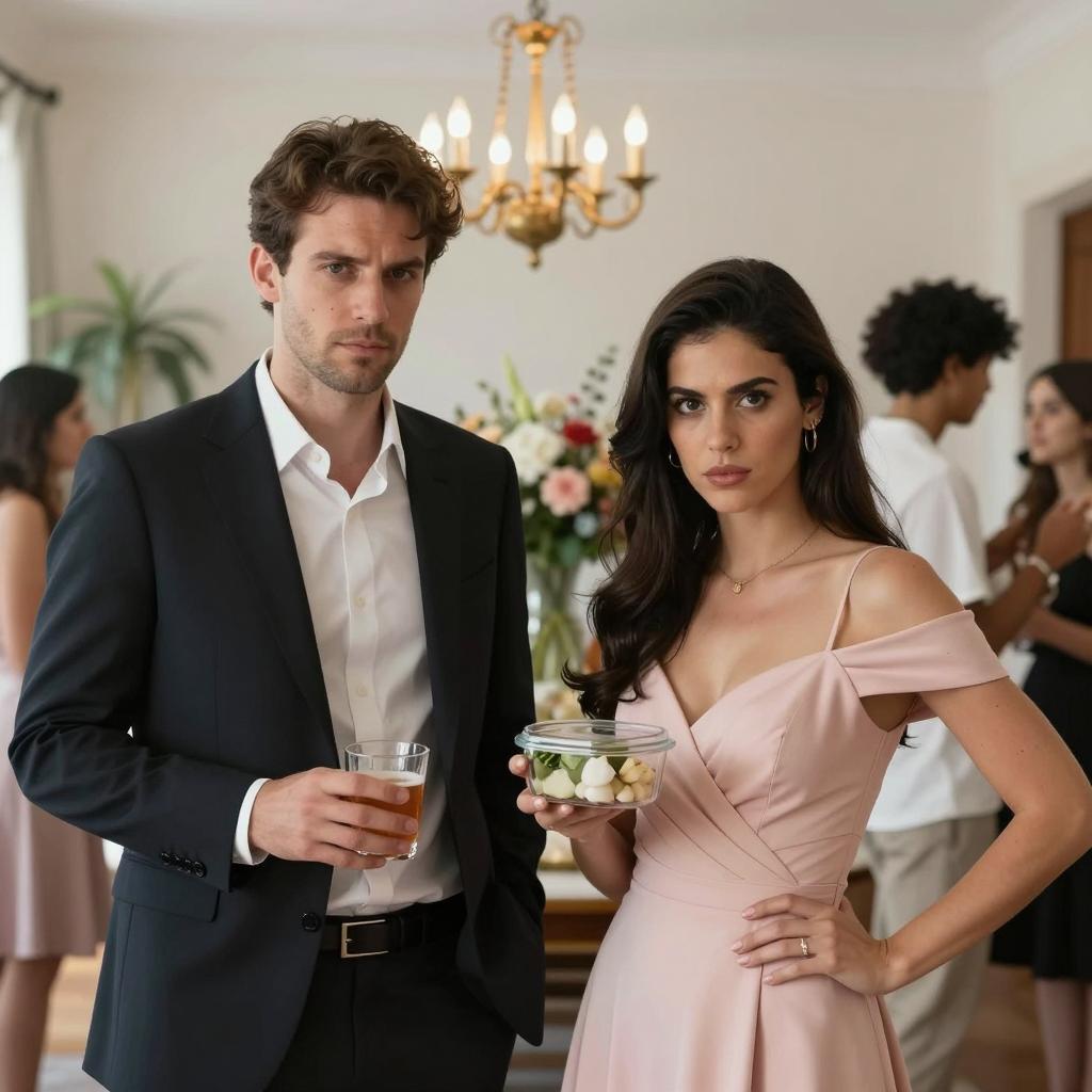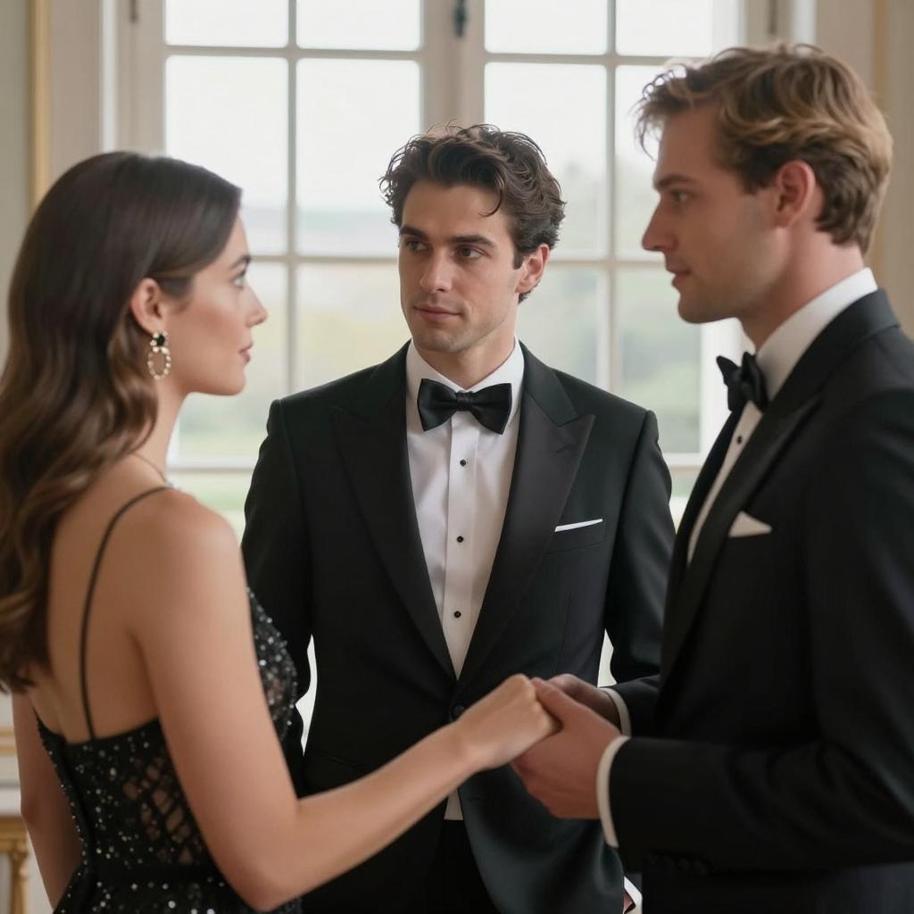 A man with gray hair in a black tuxedo holds a laptop and a phone, looking down. A woman with brown hair in an orange off-shoulder dress and white gloves smiles, looking down at the man. They are in a dimly lit room with beige walls. The man is on the left, the woman is on the right. Both are standing. The woman's hair is styled up.