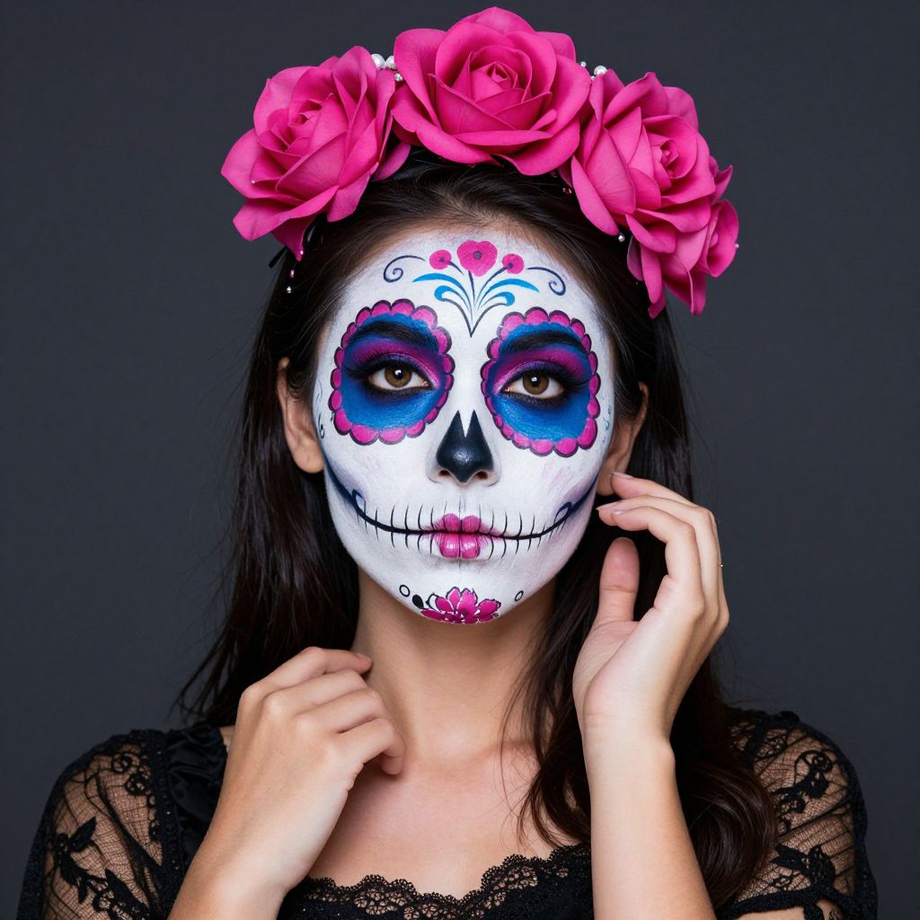 Photograph of a woman with pale skin, black hair, and brown eyes, wearing a detailed Day of the Dead face paint in white, blue, and pink. Her face features blue circular eye sockets, a black nose, and intricate pink heart and floral designs. She wears a bright pink rose headband and a black lace top. Her hands are raised, one gently touching her hair. The dark, solid background contrasts with her vibrant face paint and floral headpiece. The texture of her lace top adds a delicate, intricate element to the image.