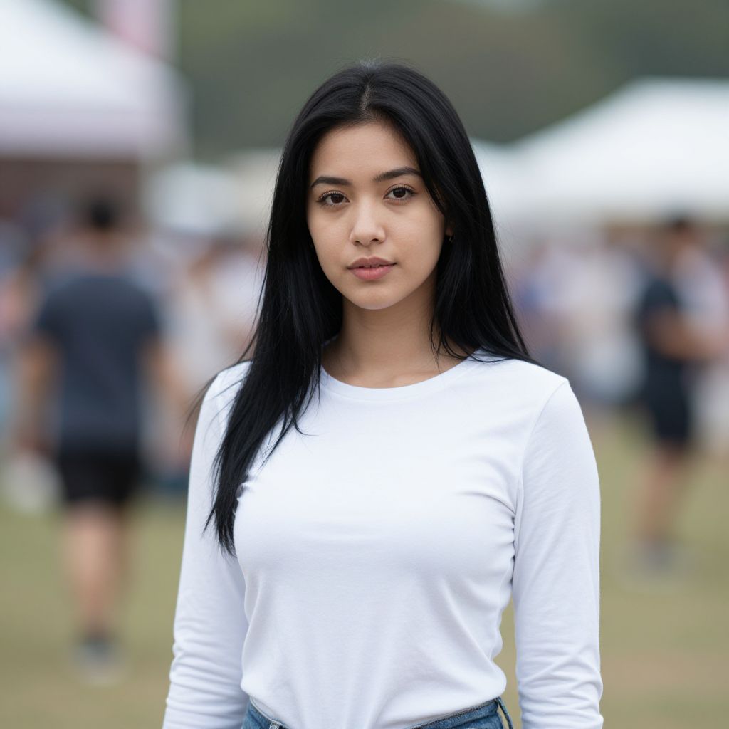 Photograph of an Asian woman with long, straight black hair and fair skin standing in a blurred outdoor setting. She wears a fitted, long-sleeve white top and has a neutral expression. The background is out of focus, showing indistinct people, white tents, and greenery, suggesting a public event or fair. Her makeup is minimal, and she stands centered in the frame, with soft natural light highlighting her features. The overall mood is calm and casual.