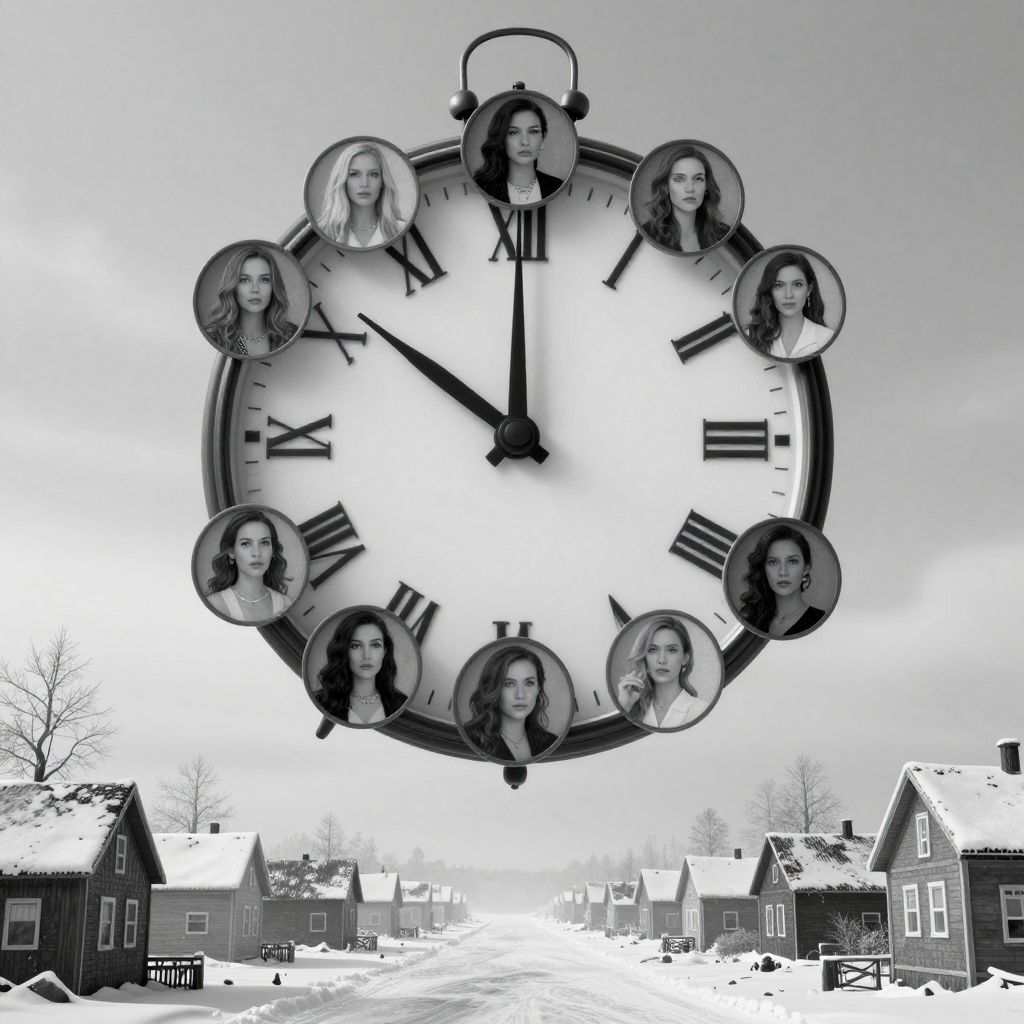 A surreal, computer-generated scene depicts a massive, floating clock with multiple hands, each pointing to a circular portrait of a woman at various stages of her life, symbolizing time's cyclical nature. The clock hovers above a desolate, snow-covered town lined with identical houses, evoking a haunting, dystopian atmosphere reminiscent of cyberpunk aesthetics. The monochromatic color palette and stark contrast between the clock and the bleak landscape amplify the image's eerie, high-definition quality.