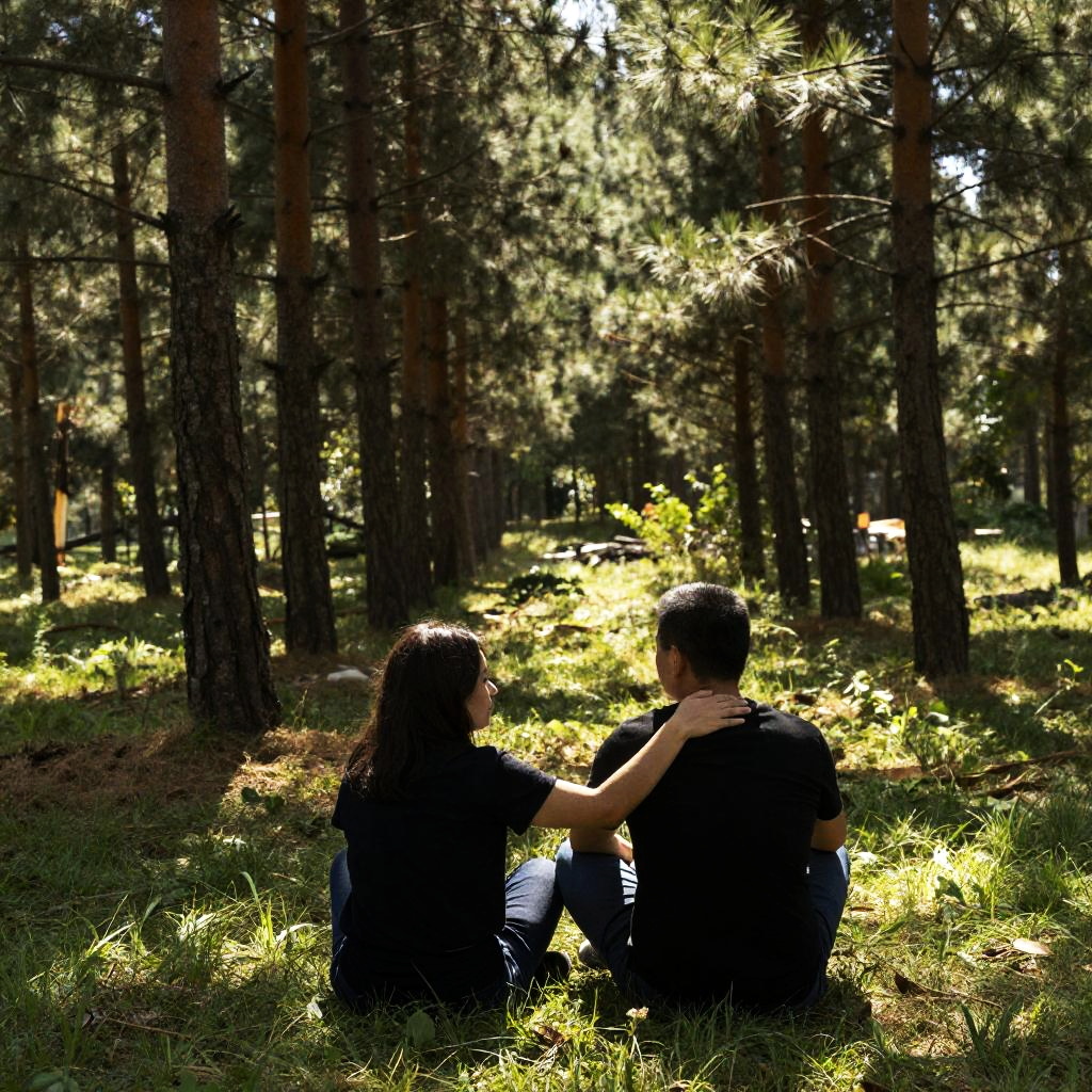 A man and woman sit on lush green grass in a pine forest with tall trees surrounding them. The woman, with dark hair and wearing a black shirt, has her arm gently around the shoulder of the man, who is also wearing a black shirt and facing away from the camera. Sunlight filters through the dense trees, creating dappled light on the forest floor.