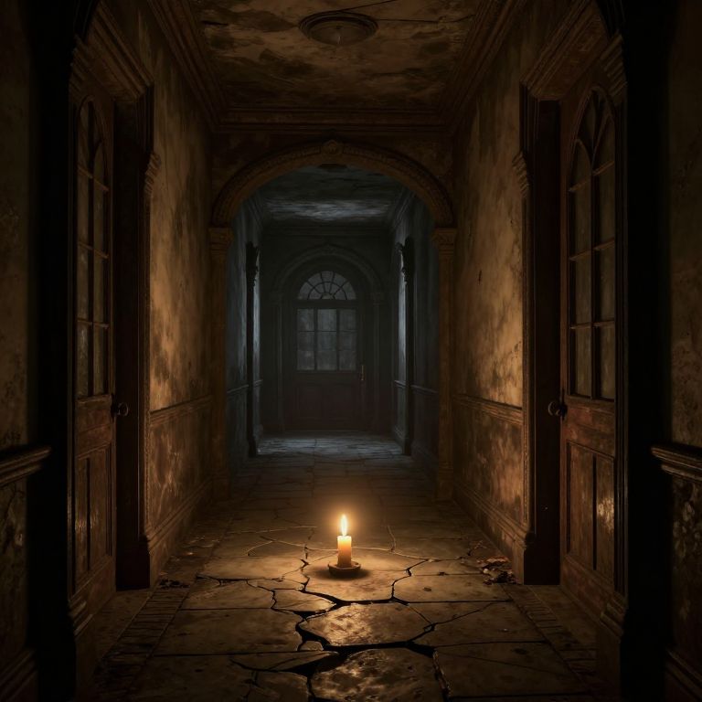 A hauntingly atmospheric 3D-rendered corridor, illuminated by a solitary candle casting warm, flickering light across cracked stone floors, evokes a sense of forgotten dreams and nostalgia within a sentient mansion, blending dramatic lighting with a vintage, cinematic aesthetic.