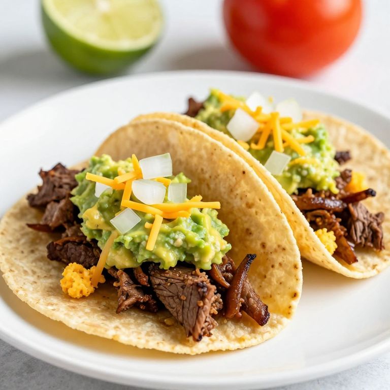 Two vibrant Slow-Cooker Beef Tongue Tacos, topped with creamy guacamole, crumbled cheese, and diced onions, are artfully presented on a crisp corn tortilla, served on a pristine white plate with a blurred background featuring a lime and tomato.