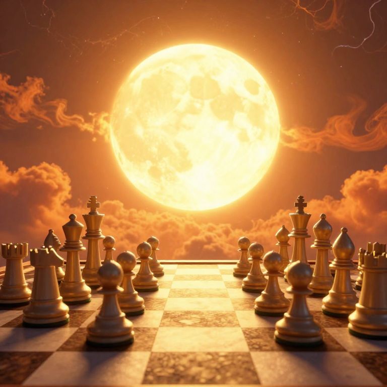 A surreal 3D-rendered scene depicts a colossal chessboard bathed in the golden glow of a massive, electrified sun, as rows of towering chess pieces stand poised for battle against a backdrop of fiery orange skies and swirling clouds, evoking a dramatic and otherworldly atmosphere.