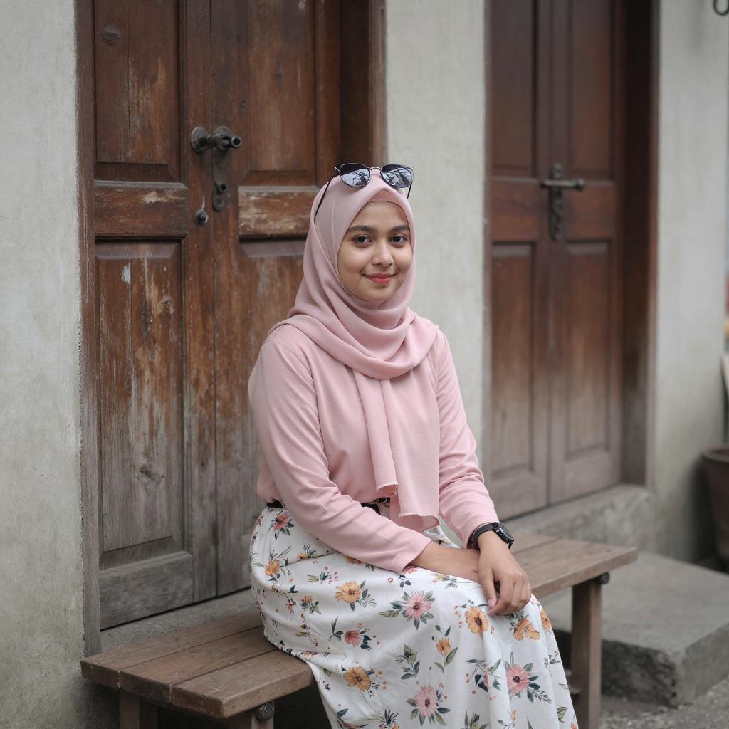 Photograph of a young Southeast Asian woman with medium skin tone, black hijab, black turtleneck, and black pants, sitting on a wooden chair with a brown jacket. She wears a silver watch and rests her left arm on the chair. Background includes a gravel path, trees, and people seated at tables under a black canopy.