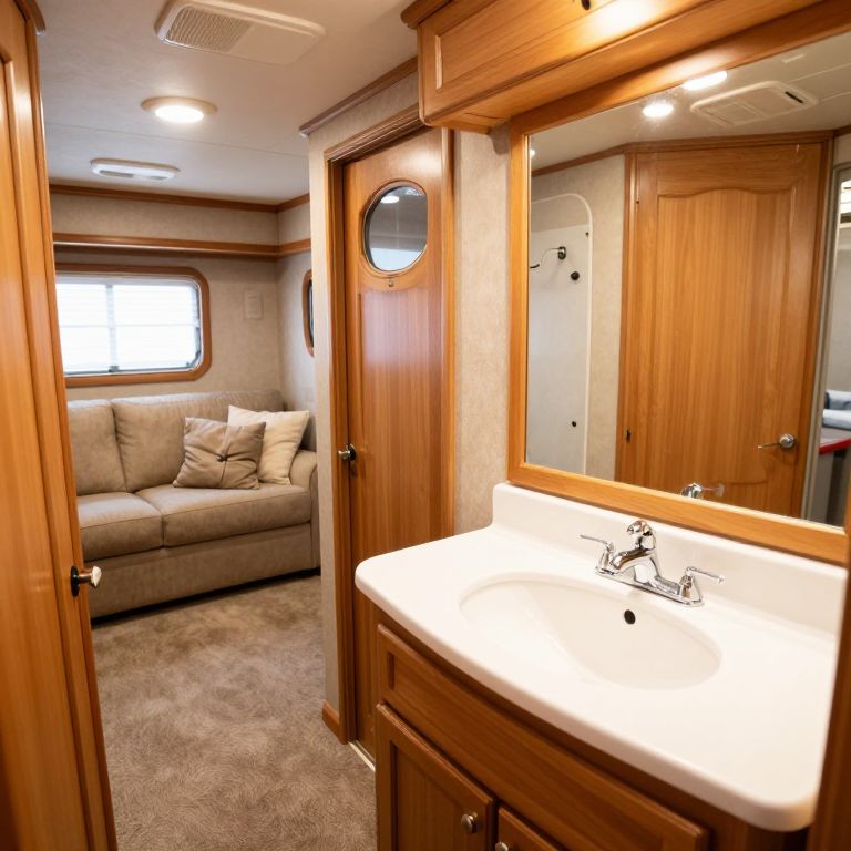 Photograph of a compact RV interior featuring warm wooden cabinetry and trim. In the foreground, a white ceramic sink with silver fixtures is mounted on a wooden vanity with a large mirror above. To the left, a cozy gray fabric sofa with beige and brown cushions sits against the wall under a small window. The RV has beige carpeted flooring and recessed ceiling lights. A round mirror is set in the wooden door to the right, and a small, square window is visible on the far wall. The overall design is functional and warm, with a focus on comfort and efficiency.