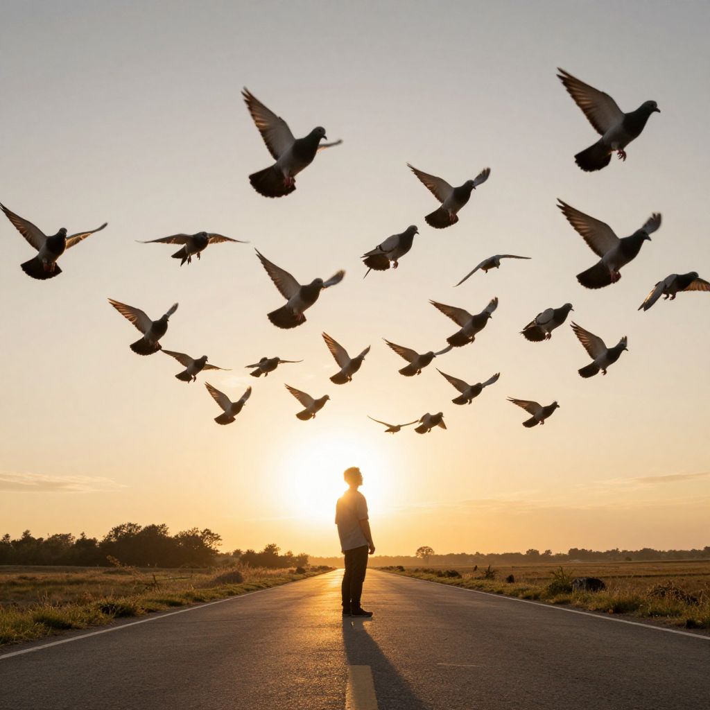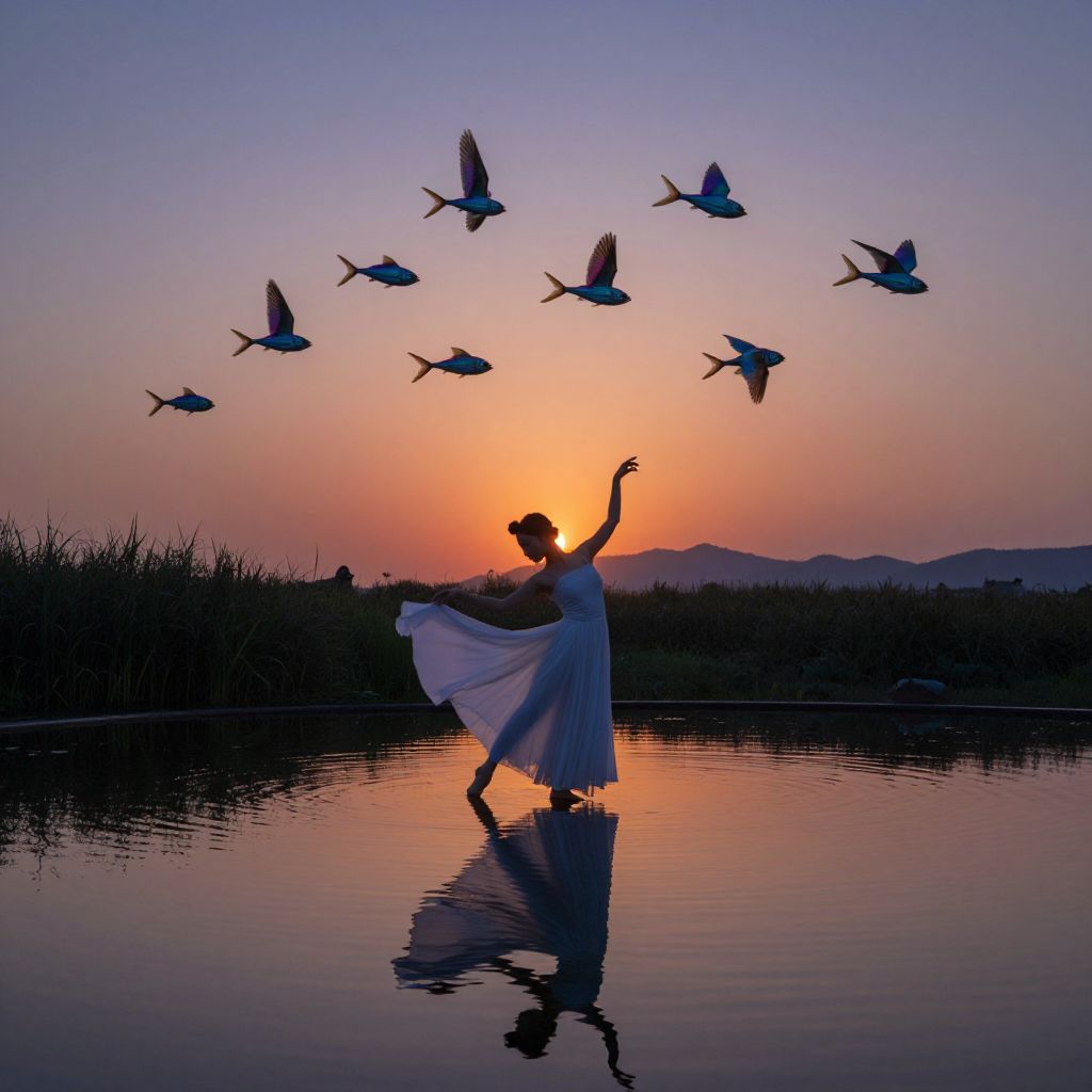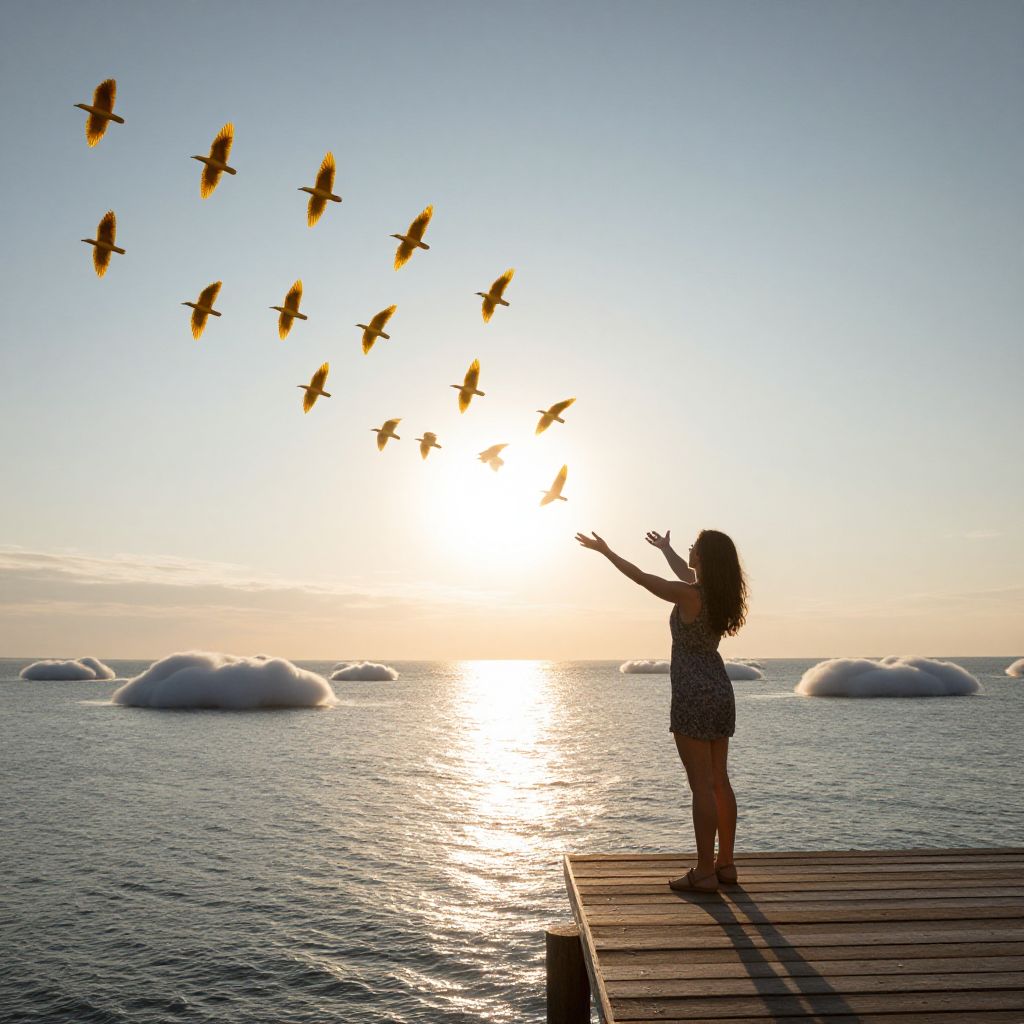 Woman standing on a wooden pier extends her arms toward a flock of golden birds that emerge from the horizon, creating a shimmering cascade of light against a serene sky and sea dotted with floating cloud-like islands.