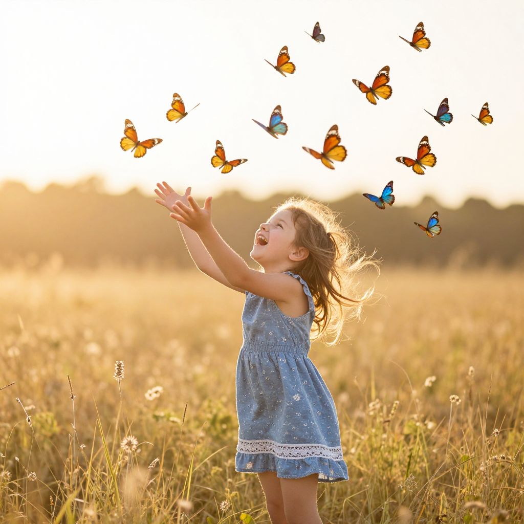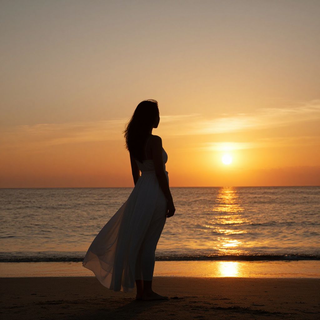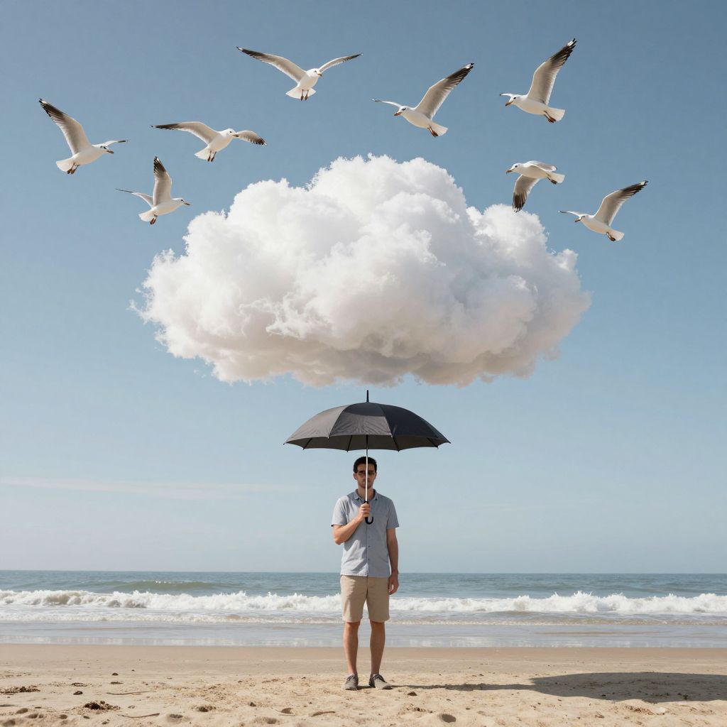 Woman standing on a wooden pier extends her arms toward a flock of golden birds that emerge from the horizon, creating a shimmering cascade of light against a serene sky and sea dotted with floating cloud-like islands.