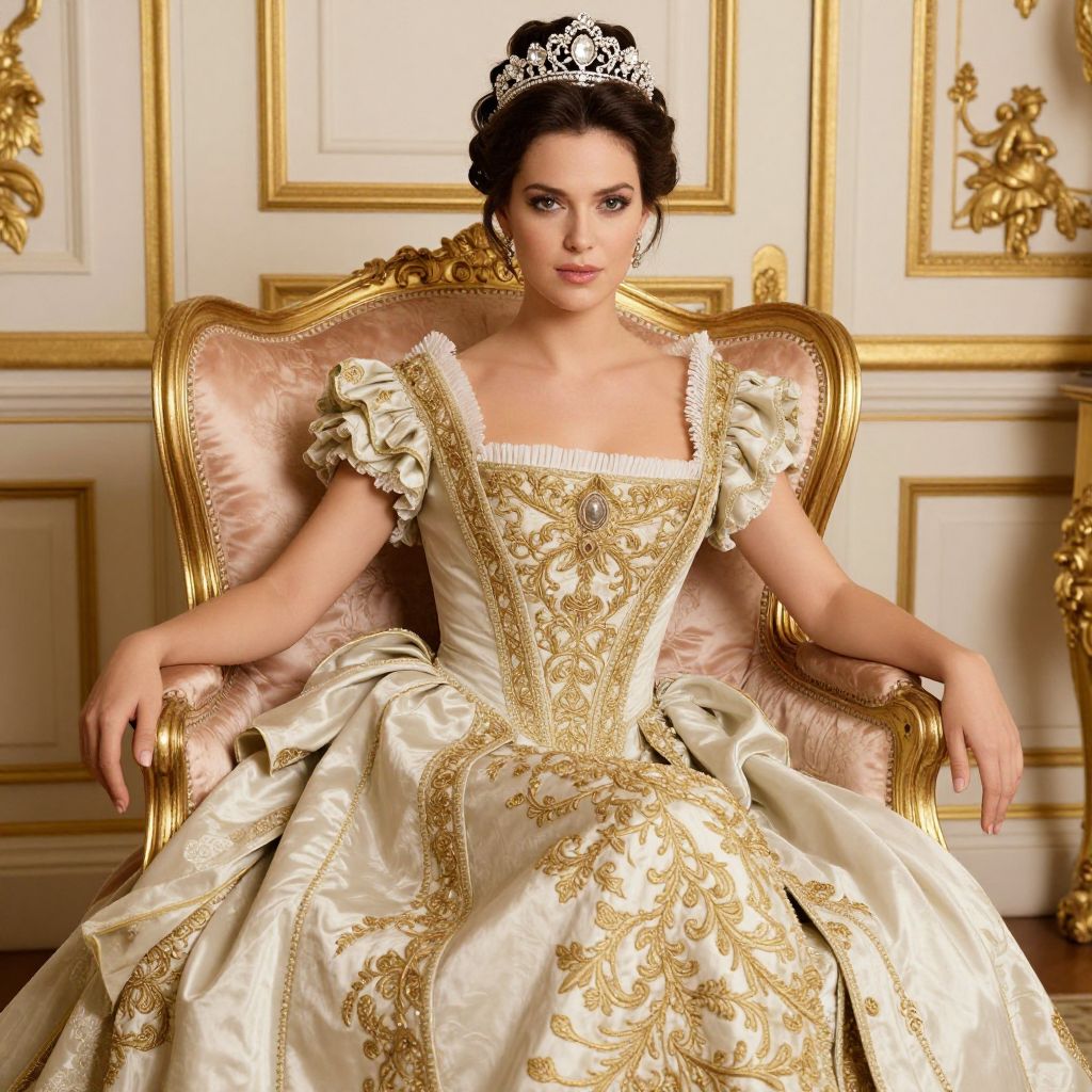 Photograph of a young woman with fair skin and dark hair styled in an elegant updo adorned with a silver tiara. She sits regally on an ornate, gold-framed, pink velvet chair in an opulent room with white paneled walls accented with gold trim. She wears an elaborate, off-the-shoulder cream satin ball gown with intricate gold embroidery and puffed sleeves. Her expression is composed and confident. The rich textures and luxurious details of the gown and chair create a sense of grandeur, while the lighting highlights her elegant features and the intricate patterns of her dress.