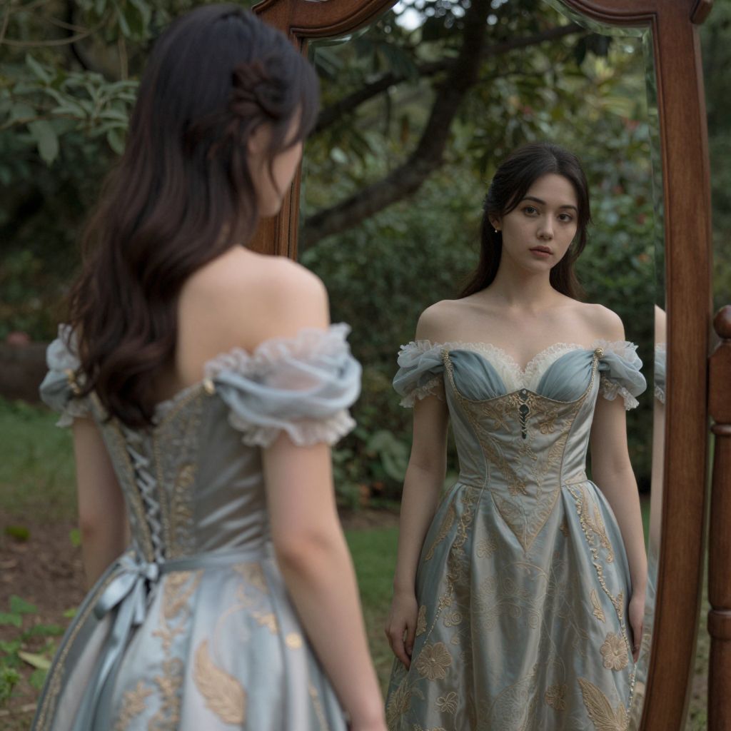 Captured in a moment of timeless elegance, a woman in an ornate gown stands before a mirror, her reflection blending seamlessly with the serene garden beyond, evoking a poignant juxtaposition of modern self-awareness and classical beauty amidst the whispers of nature’s eternal tranquility.