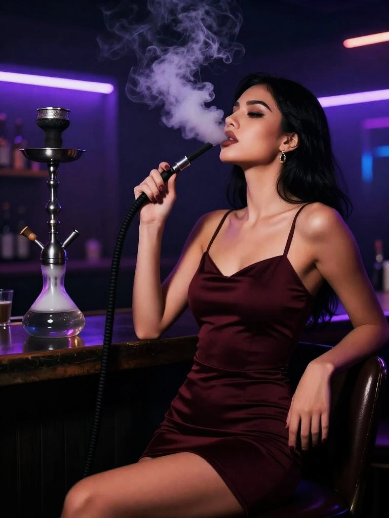 Woman smoking shisha, glamorous nightlife scene, mysterious woman with sleek jet-black hair and pale skin lounging at a bar counter, holding a long shisha hose with fragrant smoke swirling around her face, wearing form-fitting burgundy cocktail dress with thin straps, neon-lit club interior with soft purple and blue ambient lights with blurred bottles on the shelves, cinematic moody lighting, sharp focus, highly detailed, atmospheric nightlife photography