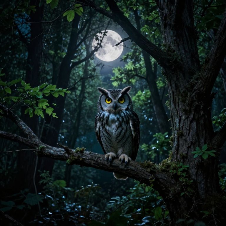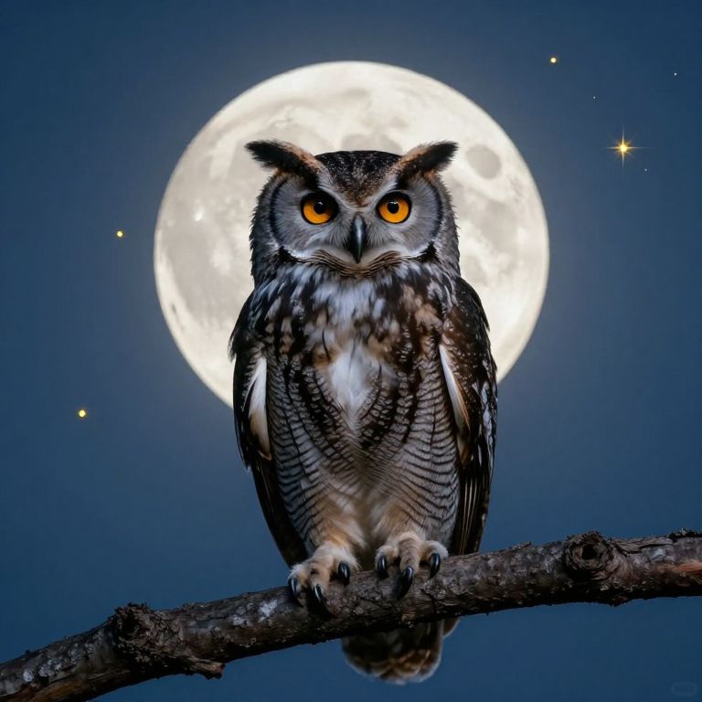 Owl perched gracefully on a dark branch, its piercing amber eyes fixed forward, set against a backdrop of a luminous full moon and scattered golden stars.