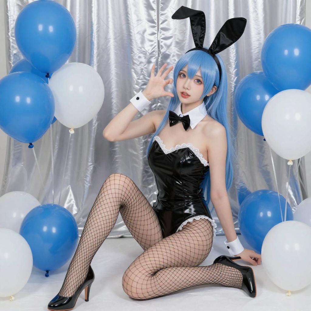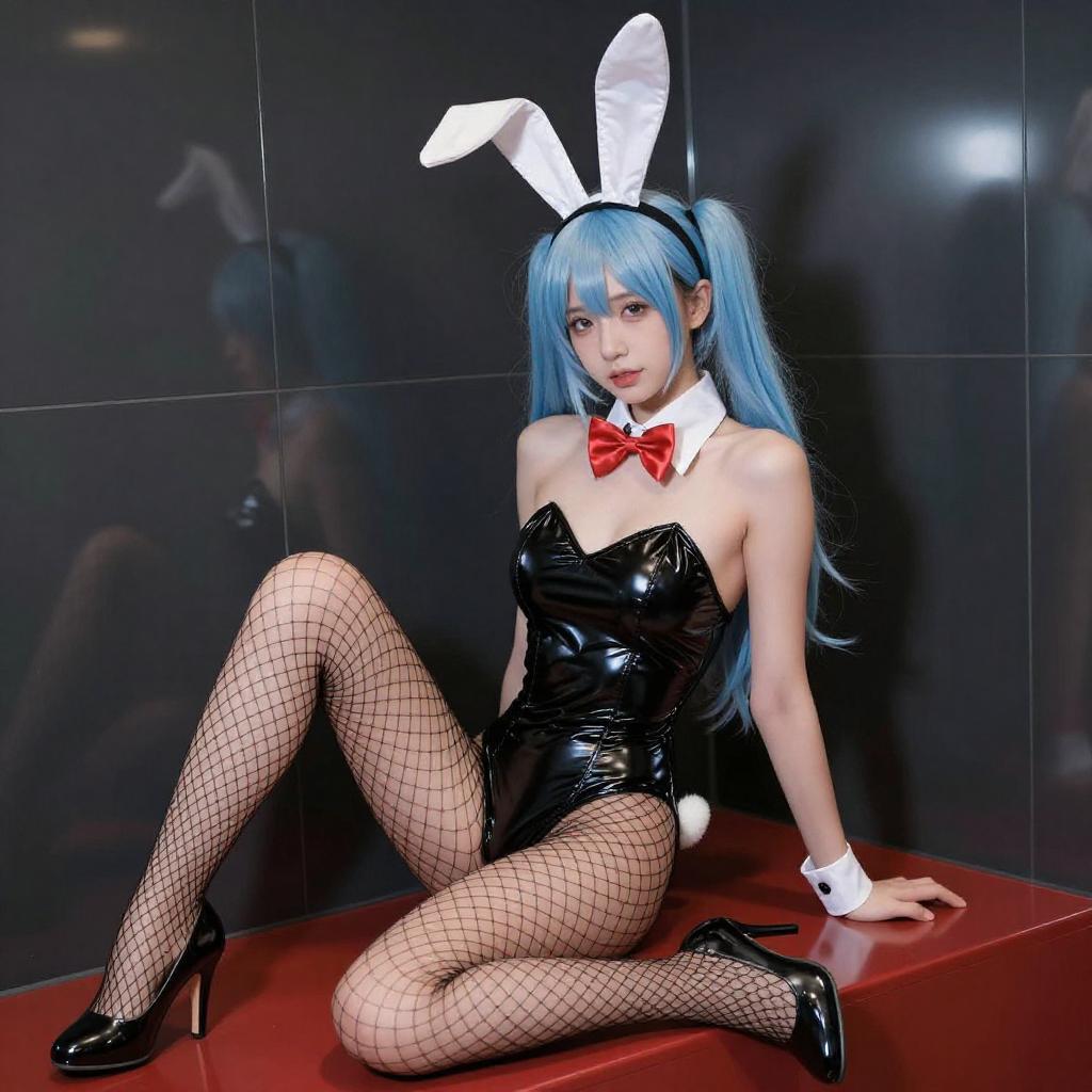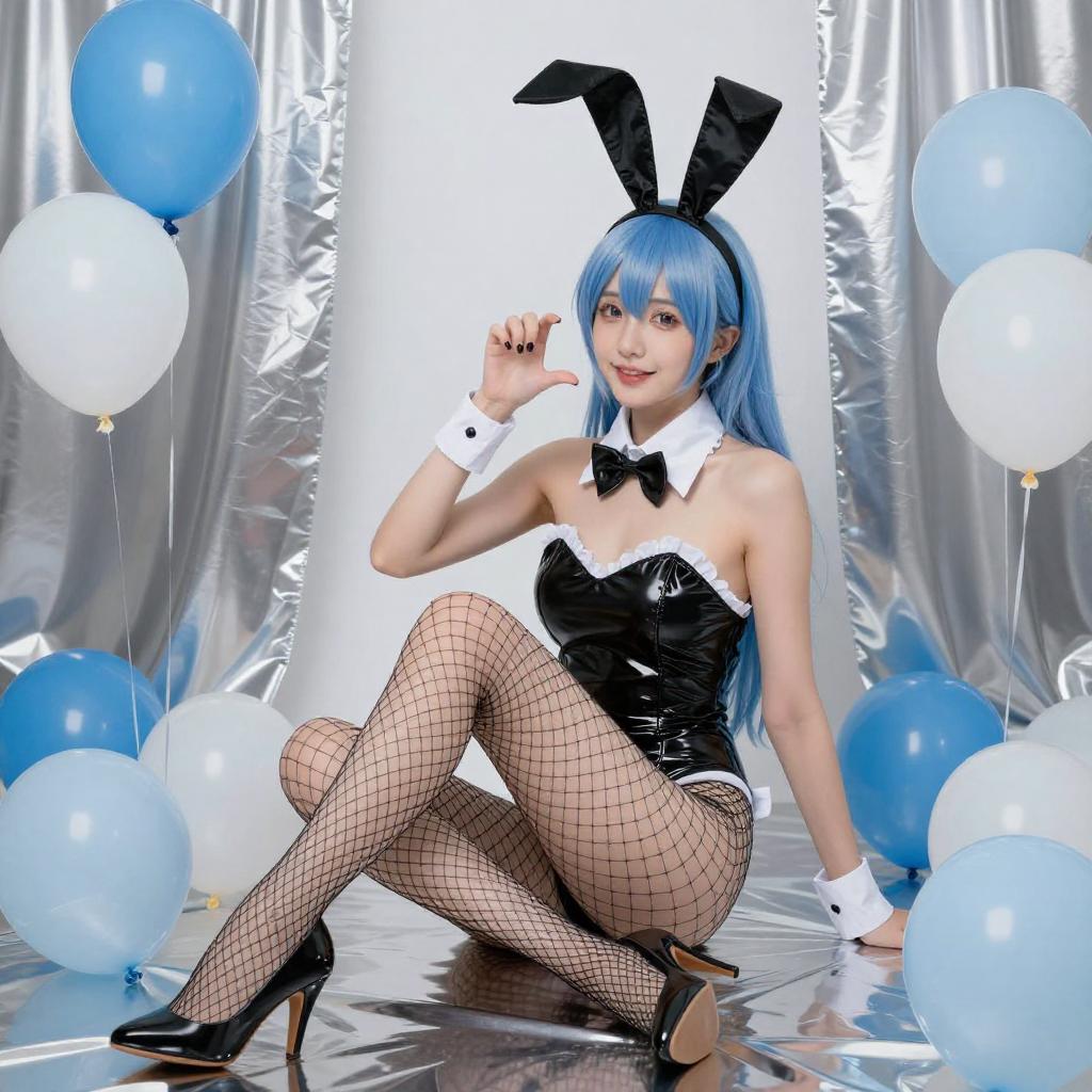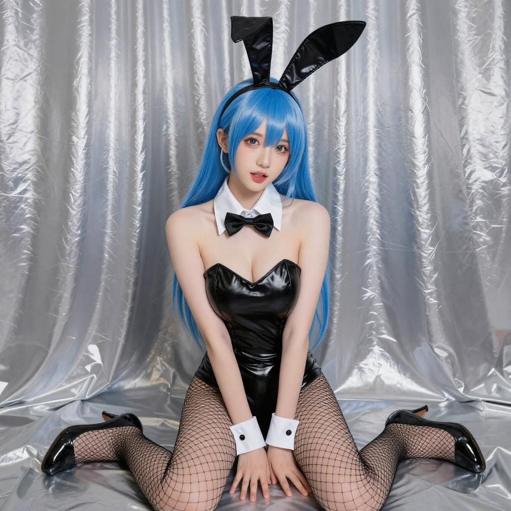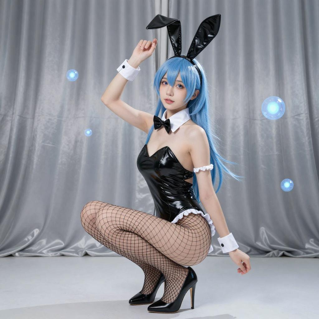 Photograph of a blue-haired woman in a pink bikini, bunny ears, and white wristbands, posing in a futuristic shower with neon lights. She's kneeling on one leg, arm raised, holding a spray bottle. Glass walls and metallic fixtures surround her.