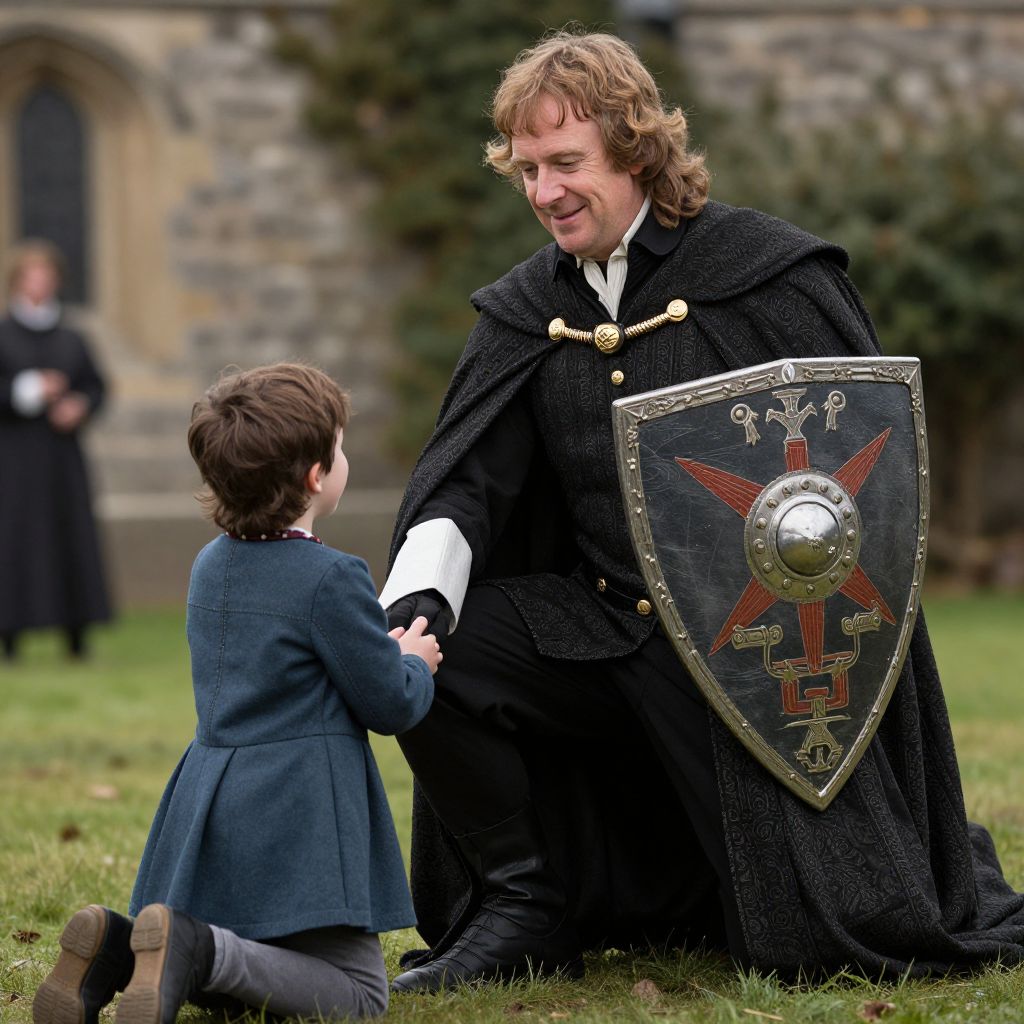 Photograph of a curly-haired man in medieval knight attire with black cloak and shield, kneeling on grass, smiling, holding hands with a young boy in