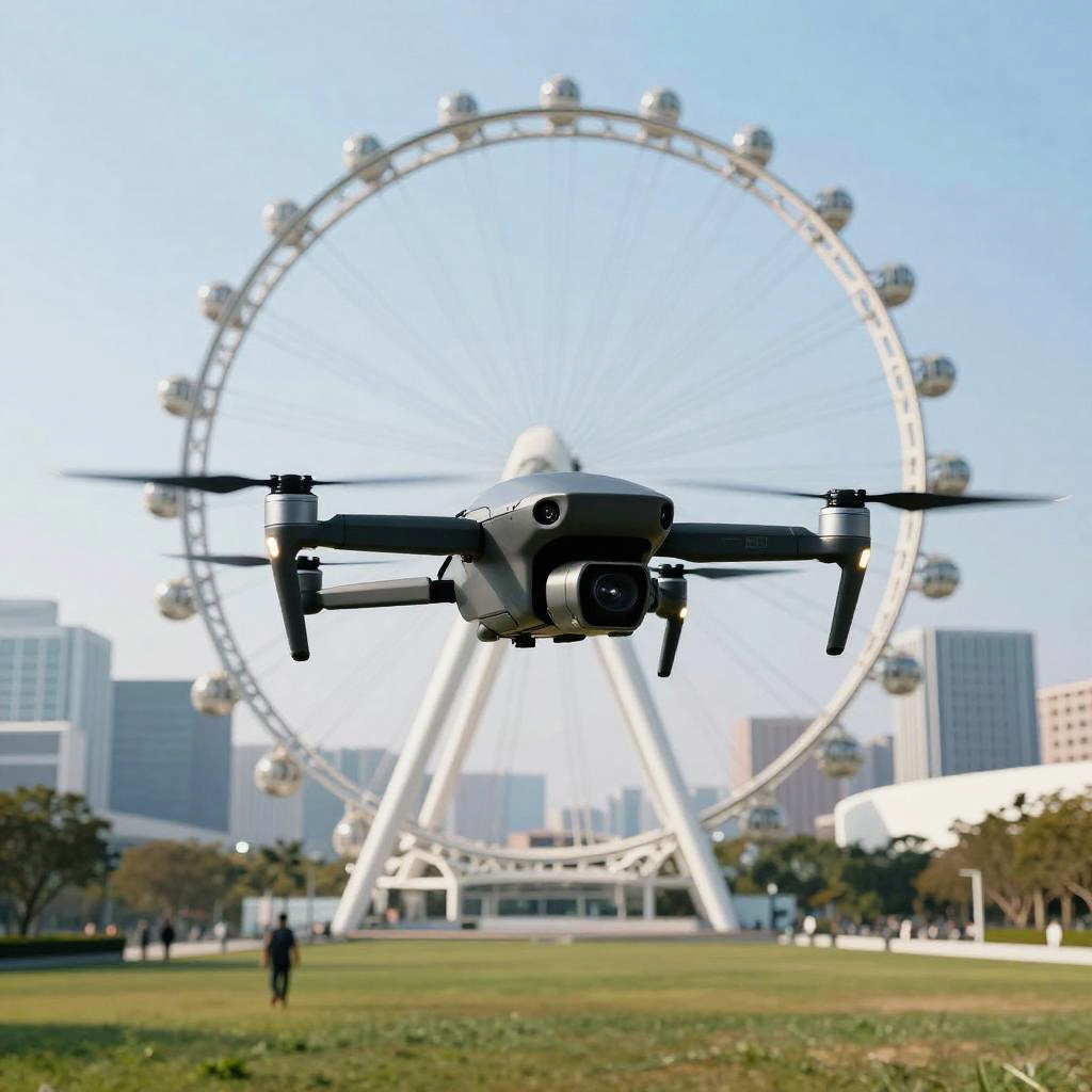 A high-tech drone with a sleek, black and blue design is flying straight ahead, captured in mid-air. The drone has four white LED lights on its arms, and its nose is illuminated. In the background, there are tall, modern buildings with glass and steel facades, some with construction scaffolding, indicating an urban environment. The image has a slightly blurred, dynamic feel.