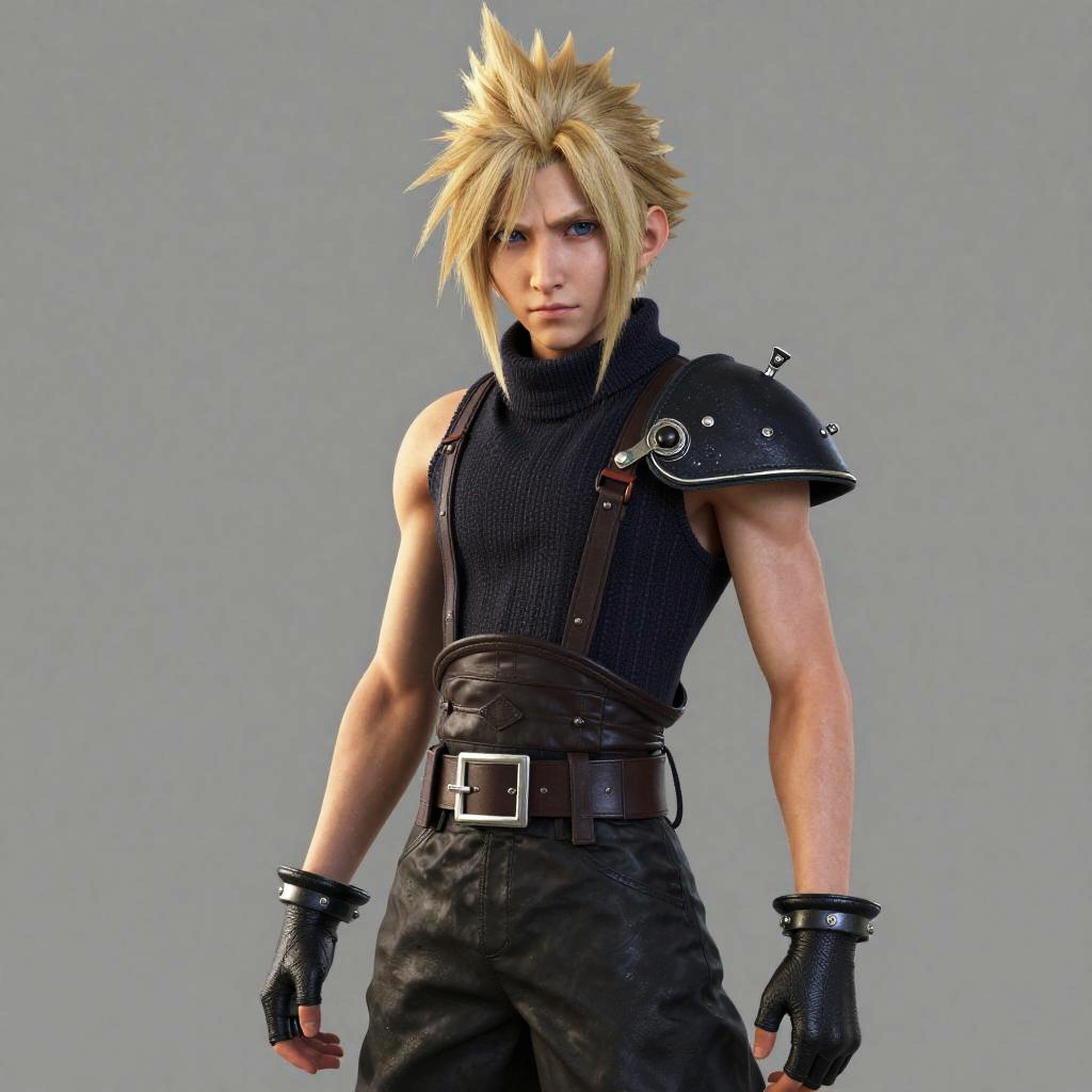 Realistic photo.Cloud Strife from Final Fantasy, depicted in a stylized anime art. Rendered in high-definition and trending on ArtStation and DeviantArt. realistic photo