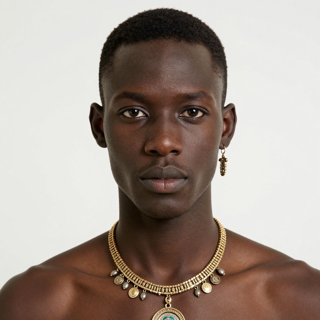 Photograph of a dark-skinned, muscular African man with short, closely-cropped black hair, gazing directly at the camera. He is shirtless, wearing a gold necklace with a large, central circular pendant and smaller, dangling pendants. He also wears a single gold earring on his left ear. His skin is smooth and evenly toned, and his expression is neutral. The background is plain white, making the subject stand out prominently. The image is sharply focused, highlighting the texture of his skin and the details of his jewelry.