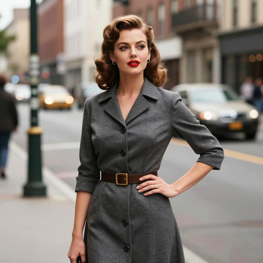A stylish woman with classic 1950s-inspired curled hair and bold red lipstick, wearing a fitted gray coat dress with a brown belt, standing confidently on a city street. The urban background features blurred cars and a lamp post, evoking a nostalgic, retro vibe.