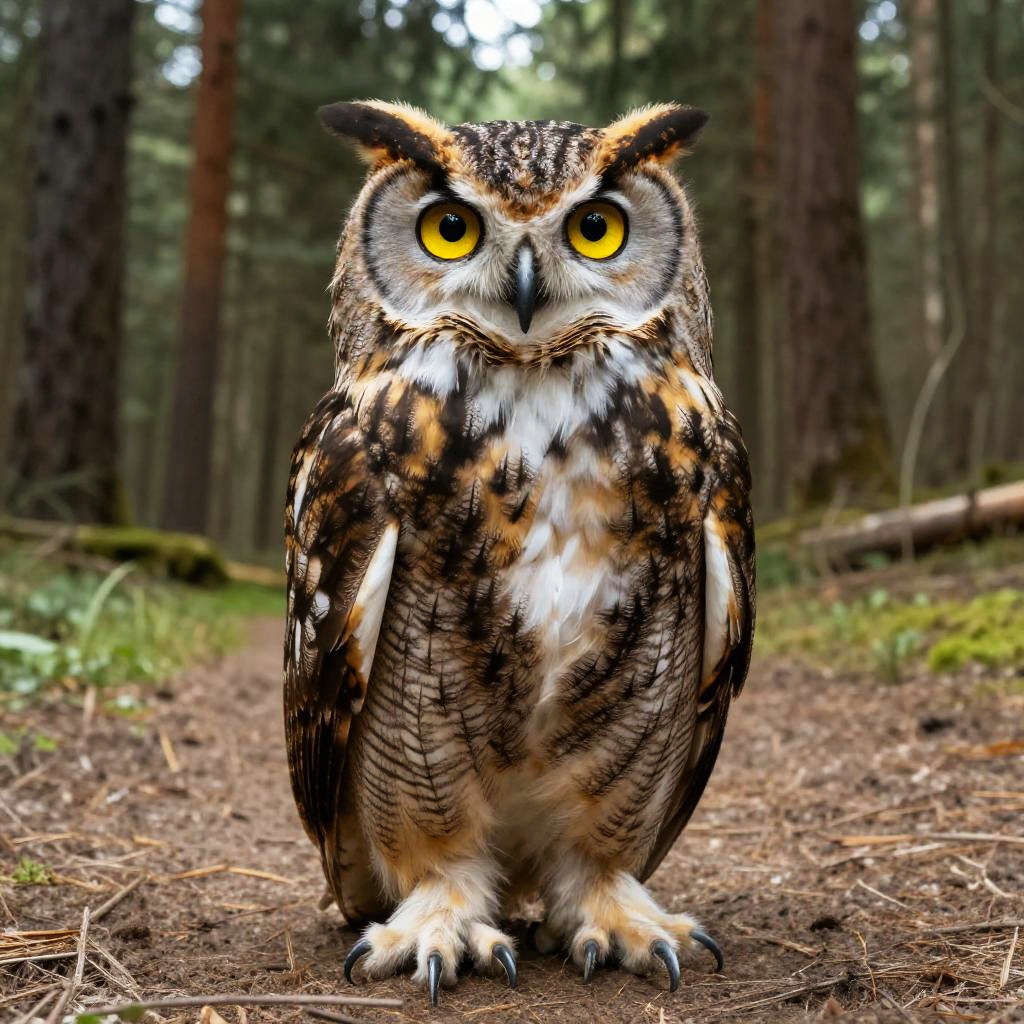 A highly detailed, digital CGI image of a large, majestic owl standing in a dense forest. The owl has bright, intense yellow eyes, a brown and white speckled feather pattern, and a dark, beak-like face. Its talons are visible on the forest floor, which is covered in moss and fallen leaves. Sunlight filters through the trees, casting a dappled light on the owl and forest. The background features blurred, tall trees, creating a sense of depth and focus on the owl. The overall style is realistic with a slightly exaggerated, vibrant color palette.