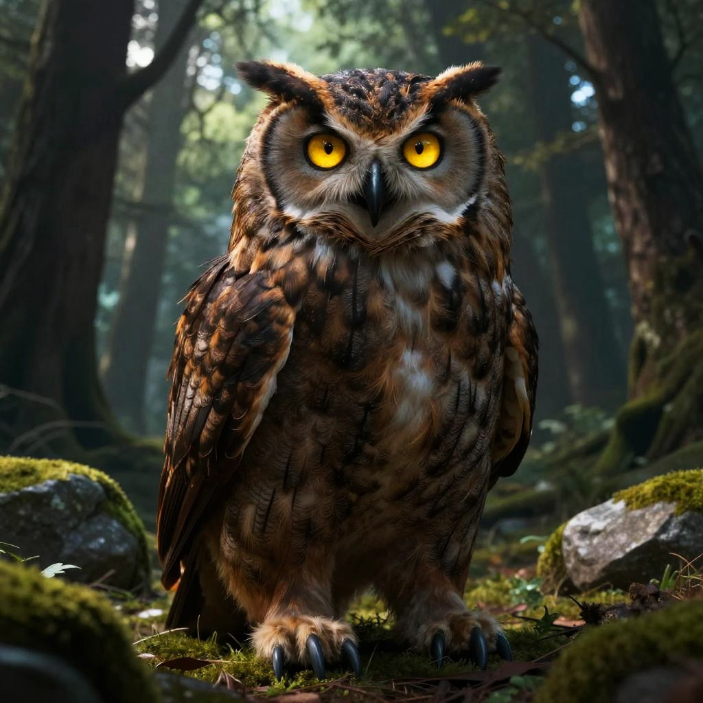 Photorealistic digital artwork of a large, intense-eyed brown owl with striking yellow eyes, standing on moss-covered forest floor, surrounded by tall trees and