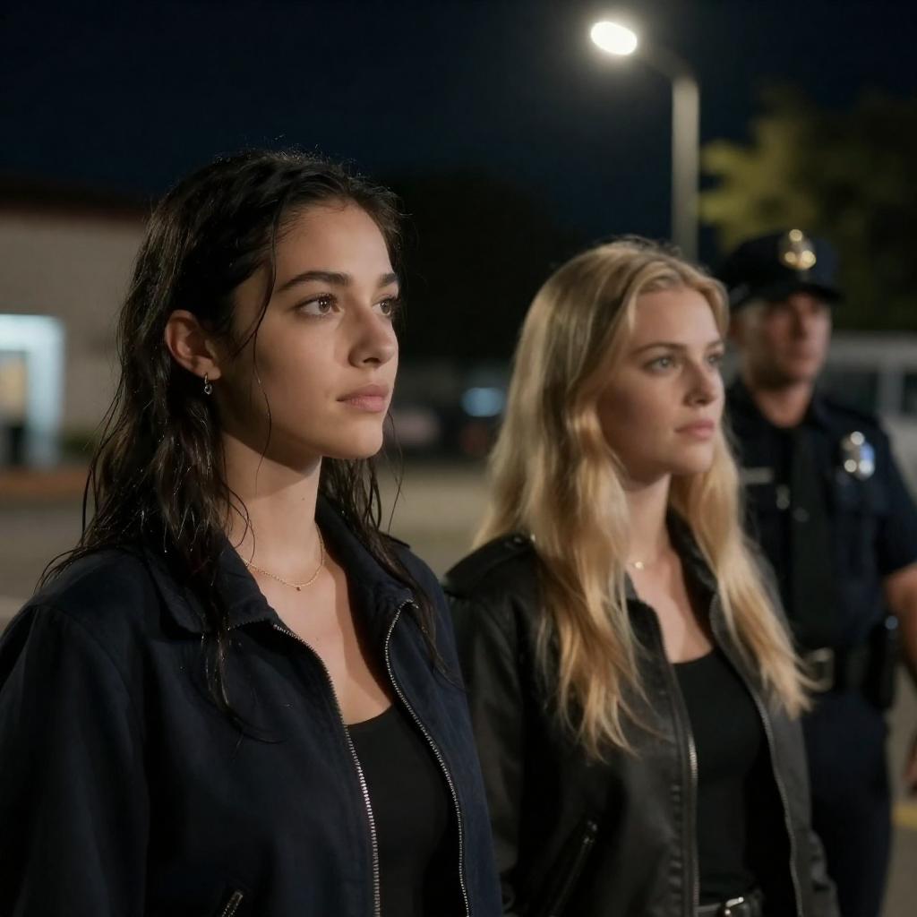 Photograph of two women in a red car. The blonde woman in the foreground has blue eyes, long hair, and wears a denim jacket, looking intently forward. The brunette woman in the background has dark eyes, long hair, and wears a black top, looking to the left. Sunlight illuminates the scene from the right.