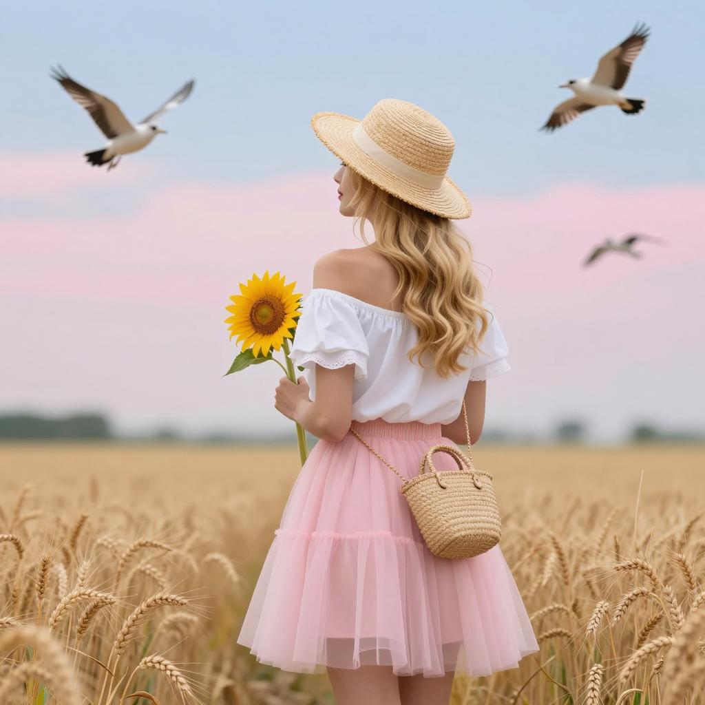 Woman with long, wavy brown hair wearing a yellow dress and straw hat, kneeling on a blanket. She holds a small Yorkshire Terrier in a yellow dress. Purple flowers and white flowers surround them. Wicker basket in the background. Purple trees in the background. Woman smiling, dog looking forward. One small dog on blanket, near woman's knees. Outdoor setting.