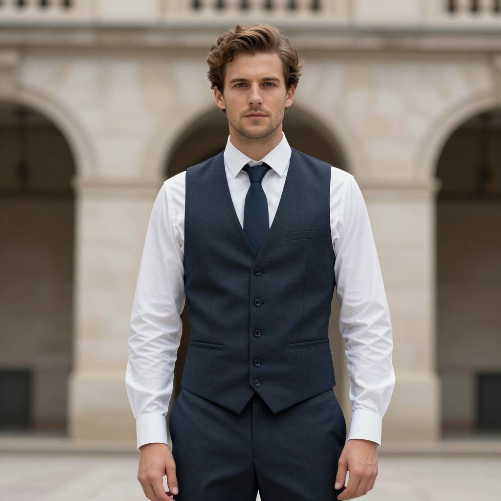 Sebastian Costume, man in a vest and tie standing in front of a building