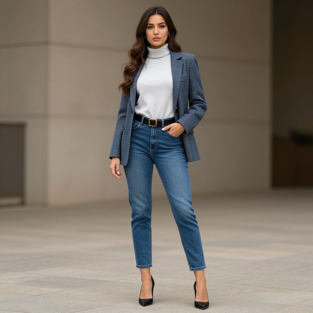 "Woman, modern urban, vibrant teal blazer with notched lapels and striped cuffs, white casual tee underneath, black leather-look skinny pants, minimalist style.. Sexy. Pretty face and beаutiful eyes. Big breasts."