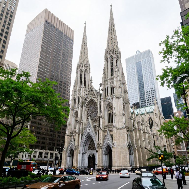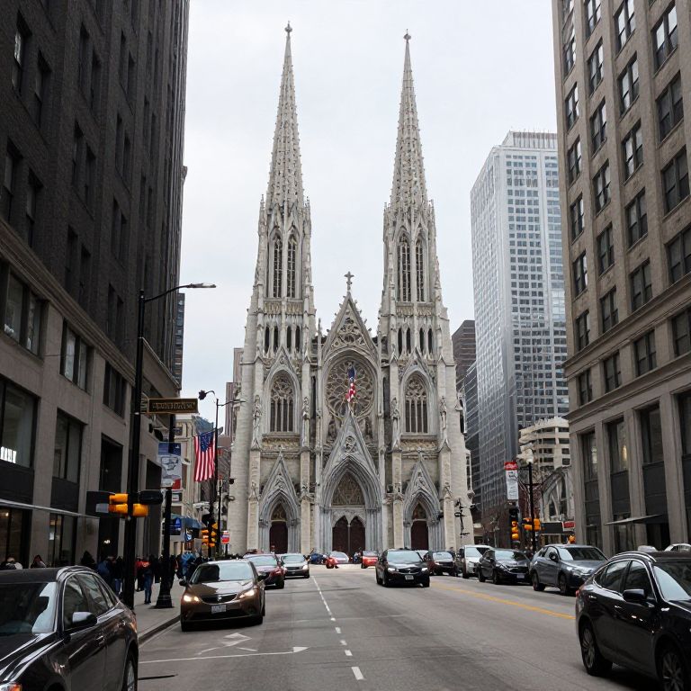 Cars navigate a bustling urban street flanked by tall buildings, with the Holy Name Cathedral's iconic spires and American flags prominently centered in the background, capturing the vibrant energy of downtown Chicago on December 19, 2018.