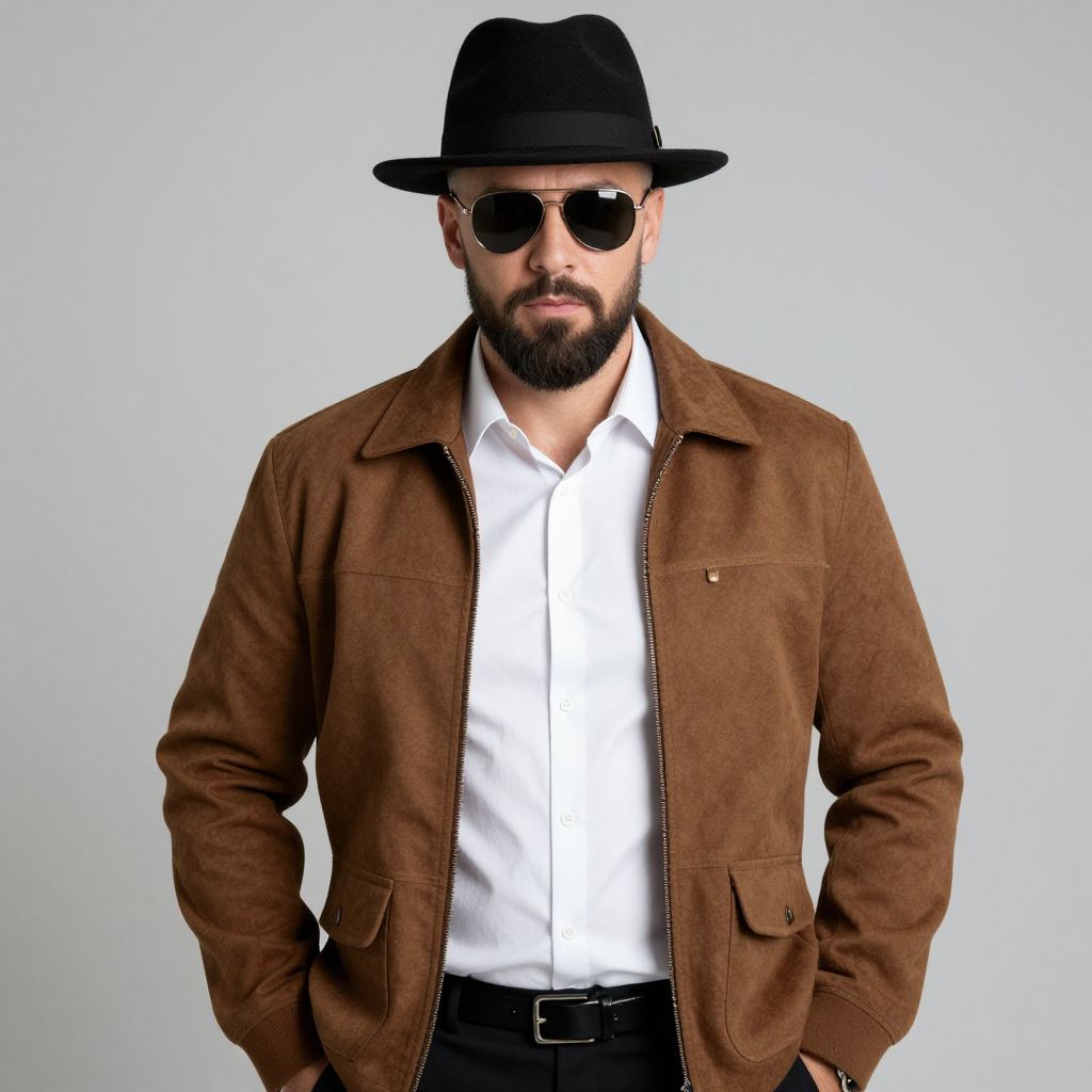 Gangster boss man costume, 1boy, male focus, solo, hat, facial hair, sunglasses, beard, shirt, jacket, collared shirt, hands in pockets, brown jacket
