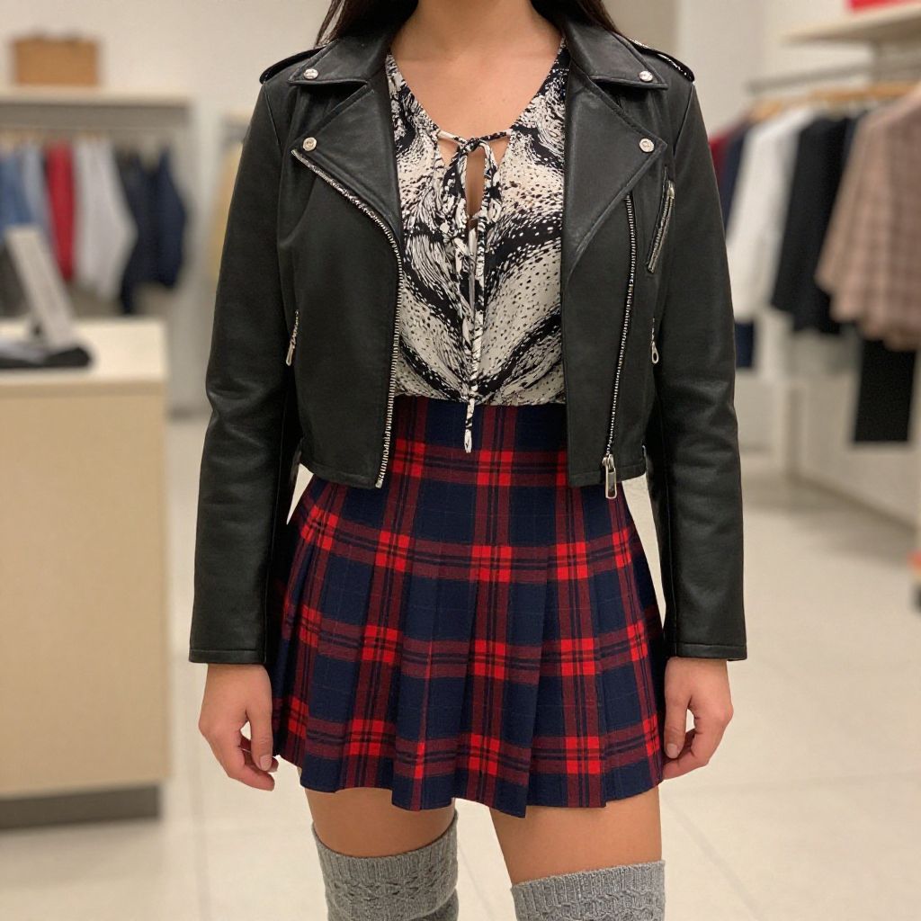 Photograph of a woman from the neck down, wearing a black leather jacket with silver zippers over a white lace top. She has on a red and black plaid mini skirt and gray, knitted thigh-high socks. Her long dark hair is partially visible. The background is a blurred clothing store with shelves and hangers holding various shirts and jackets. The lighting is bright and even, highlighting the textures of the leather jacket and lace top. The overall style is edgy and modern.