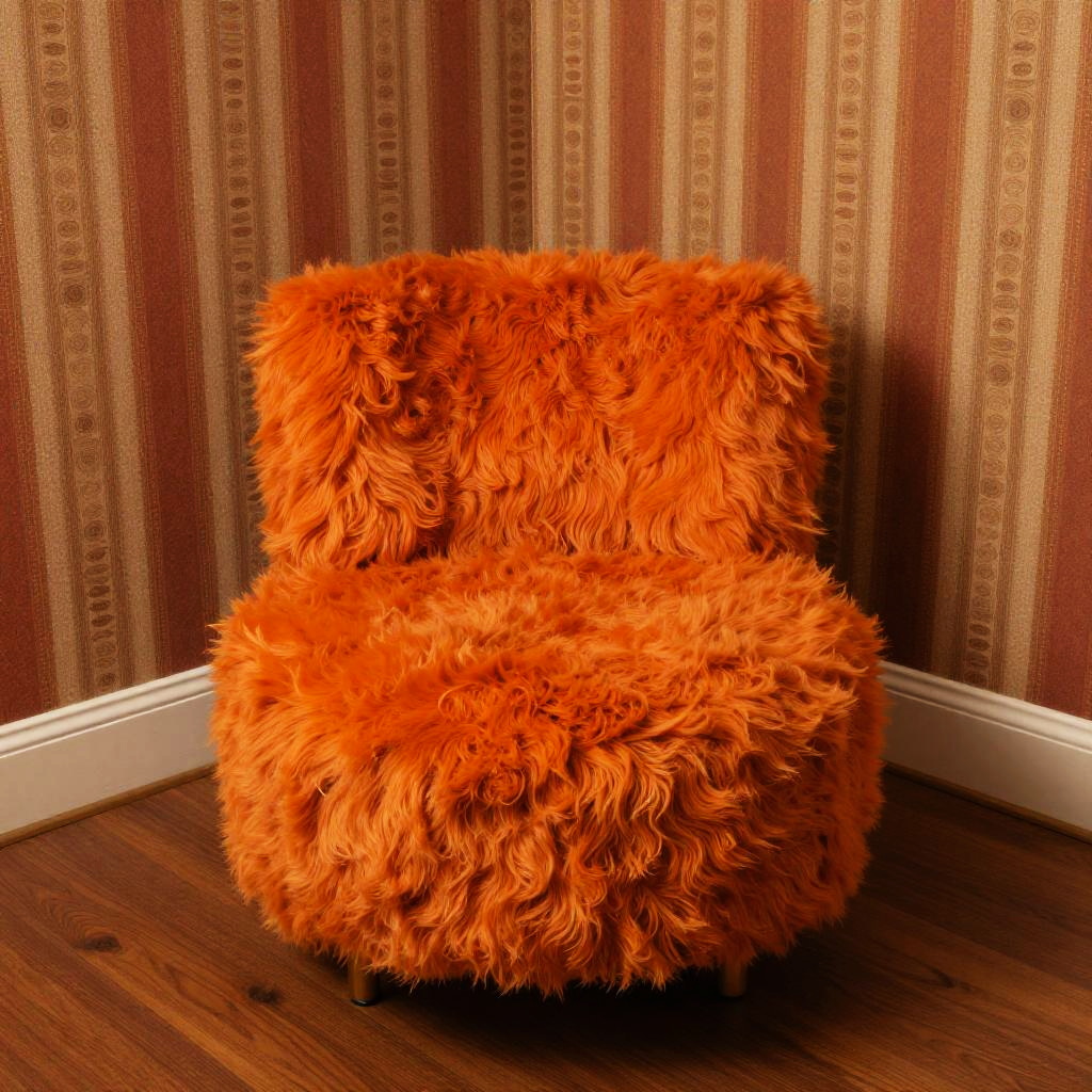 Vintage round fuzzy chair covered in vibrant orange fur, placed in a retro 70s style room with wooden floors and bold patterned wallpaper, warm nostalgic vibe