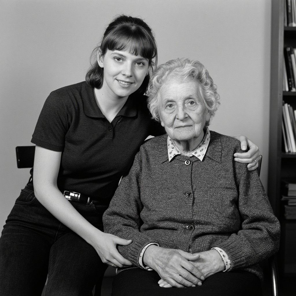 Black-and-white photograph of a young woman with dark hair and bangs, smiling, standing behind an elderly woman with curly white hair, wearing a textured