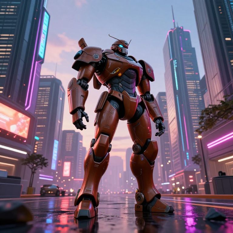Pardo, a futuristic cityscape at dusk dominated by towering skyscrapers with neon lights, featuring a sleek, brown armored mech named Pardo standing vigilant, detailed reflections on wet streets, vibrant cyberpunk aesthetics with dynamic composition.