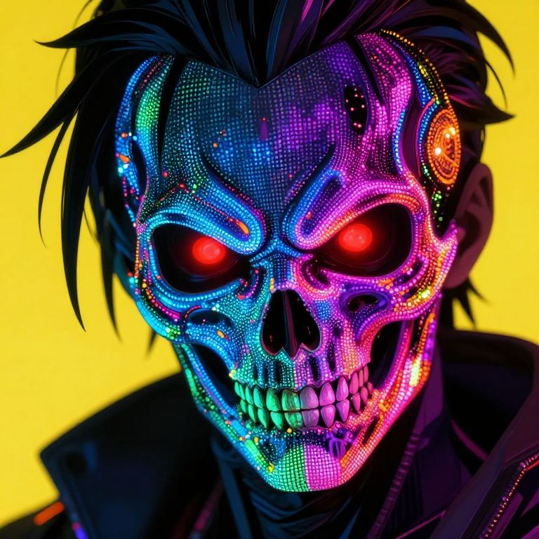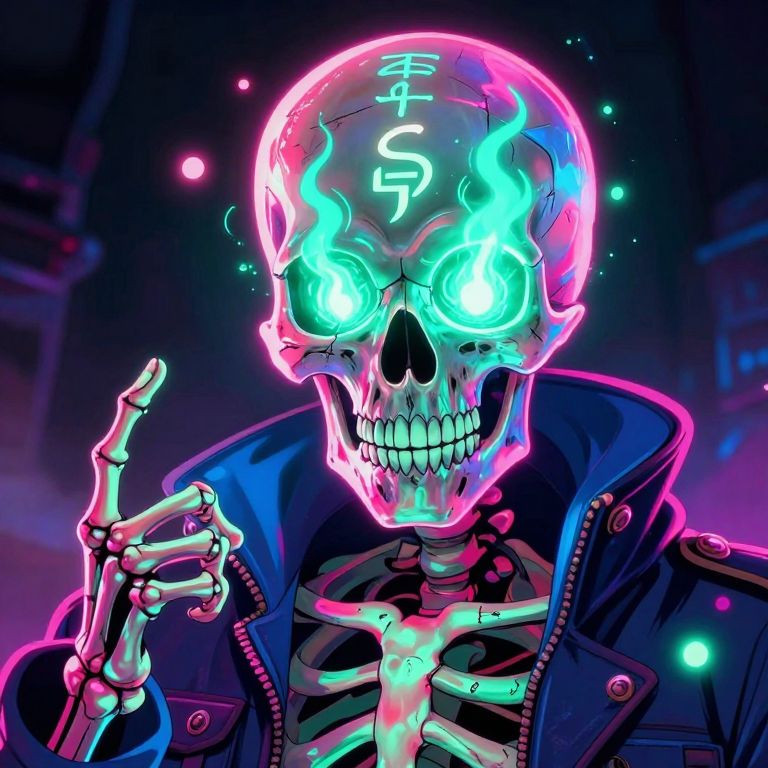 Digital art of a glowing, neon-colored skull with vivid blue and pink hues. The skull has luminescent green eyes and Chinese characters and a dollar sign on its forehead. It wears a dark blue, puffy, zip-up jacket with visible bone structure underneath. The skull's right hand is raised, displaying skeletal fingers. The background is a dark, abstract space with colorful, floating light points. The image has a futuristic, cyberpunk style with high contrast and vibrant colors.