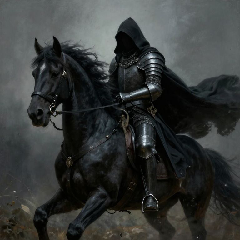 Digital artwork depicting a hooded knight in shiny, silver armor riding a powerful, black horse with flowing mane. The knight's face is obscured by the hood, adding a mysterious aura. The horse's muscles are visibly tense, showing movement and power. The background is a dark, misty, and stormy landscape with muted blues and grays, enhancing the dramatic and ominous atmosphere. The knight's armor reflects light, contrasting with the dark horse and background. The overall style is realistic with a fantasy edge, focusing on the dynamic interaction between the knight and the horse.
