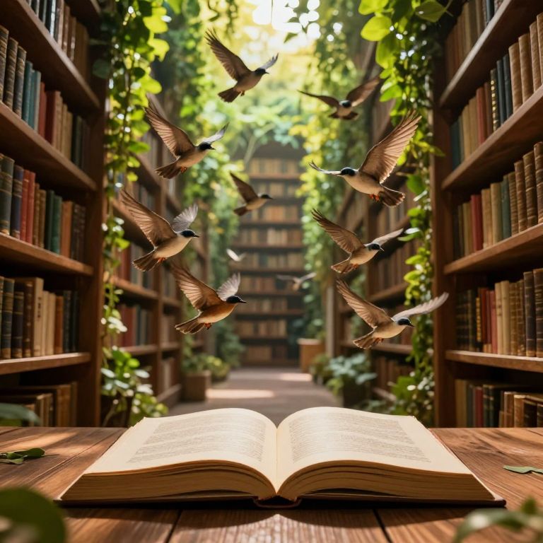 Books rest open on a wooden table, illuminated by a warm glow as seven birds take flight above, surrounded by towering shelves filled with ancient tomes and vibrant greenery cascading down the walls, creating a magical corridor that stretches toward a distant light.