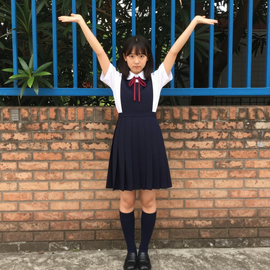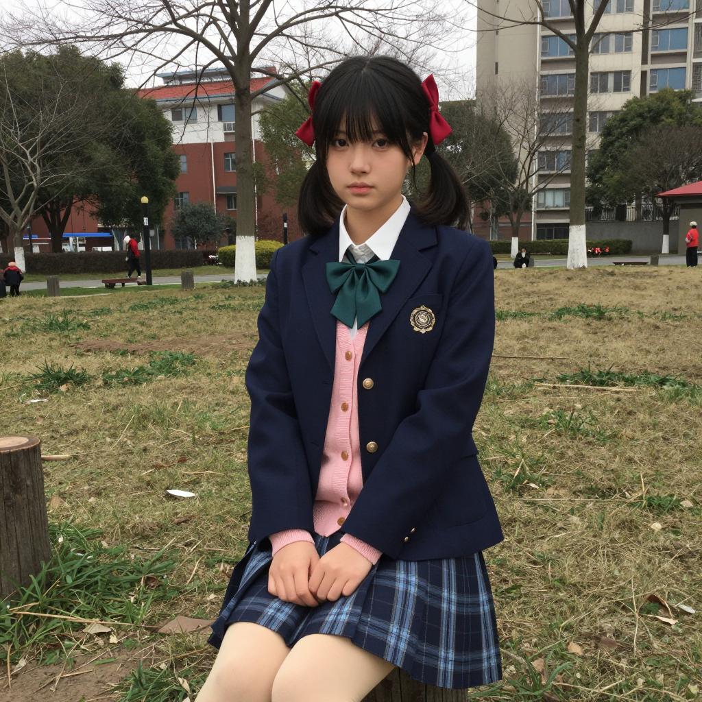 Young woman with pale skin, black pigtails with red bows, wearing a blue blazer, pink cardigan, green bowtie, and blue plaid skirt, sits on a wooden stick in a grassy park. Leafless trees and buildings in the background. She has a neutral expression.