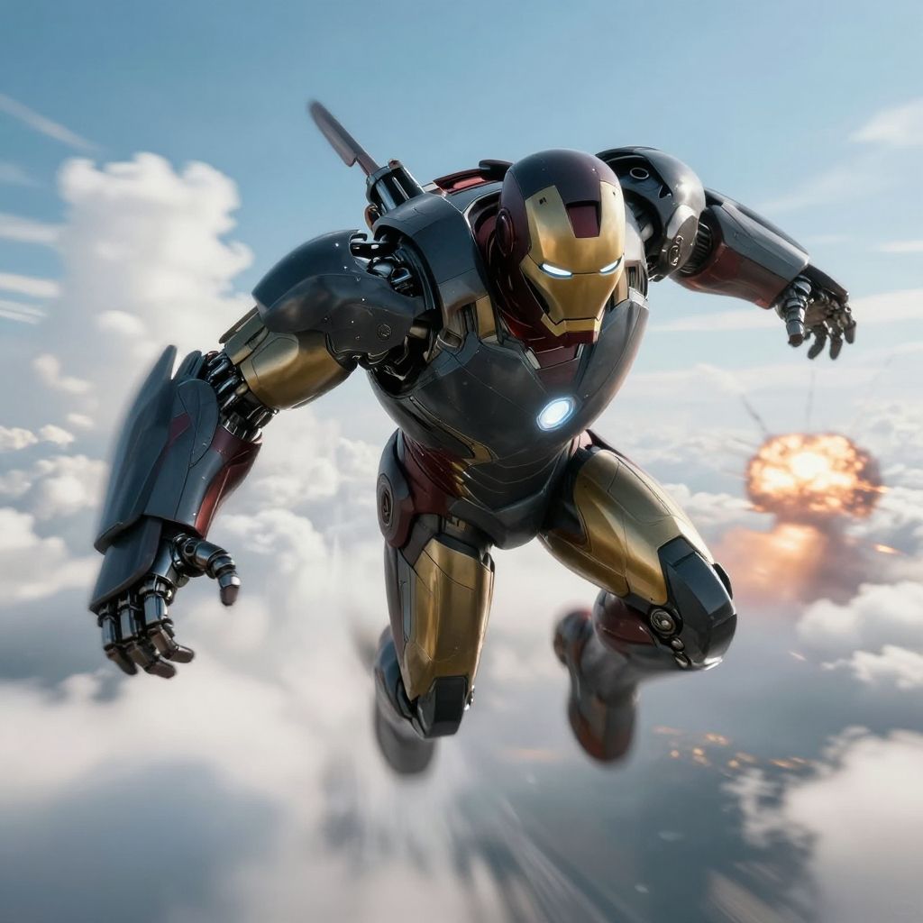 Photorealistic digital CGI image of a flying Iron Man suit, a metallic armor with a gold chest plate, red arc reactor, and black limbs, soaring above a cloudy sky. The suit has glowing blue eyes and emits a bright, fiery explosion from the right shoulder. The background shows a distant landscape with a clear blue sky and scattered clouds, enhancing the sense of height and speed. The Iron Man suit's intricate details, including joints and armor plating, are highly detailed. The explosion adds dynamic energy to the scene.