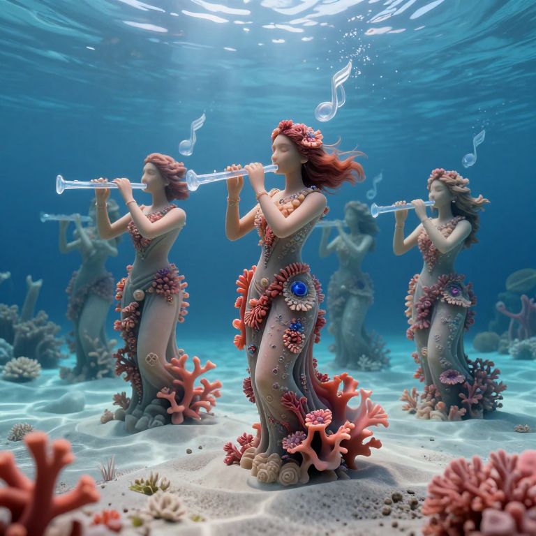 In a surreal underwater tableau, ethereal musicians adorned in coral-inspired gowns play haunting melodies on translucent flutes, their harmonious notes coalescing into fleeting sculptures that dissolve upon contact with the sandy ocean floor, captured in a high-definition 3D-rendered fantasy scene.