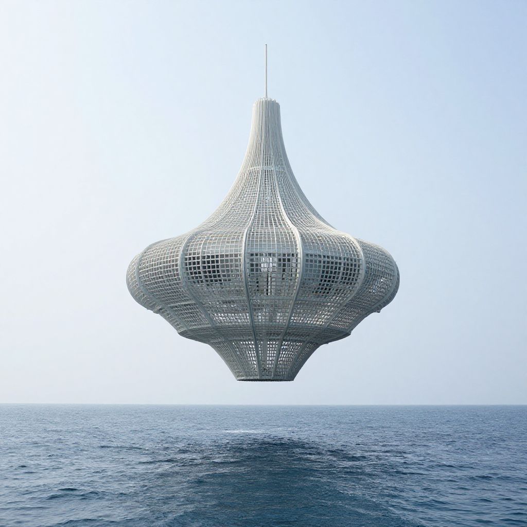 Photograph of a futuristic, silver, lattice-structured, teardrop-shaped floating structure hanging above a calm, blue ocean. The structure's intricate, grid-like design creates a web-like pattern, with a single vertical antenna at the top. The bright, clear sky forms a stark background, highlighting the structure's sleek, modern design. The ocean below is calm with gentle ripples, and the horizon is faintly visible, blending into the sky. The image has a minimalistic, almost ethereal quality, emphasizing the structure's unusual, architectural beauty against the natural seascape.