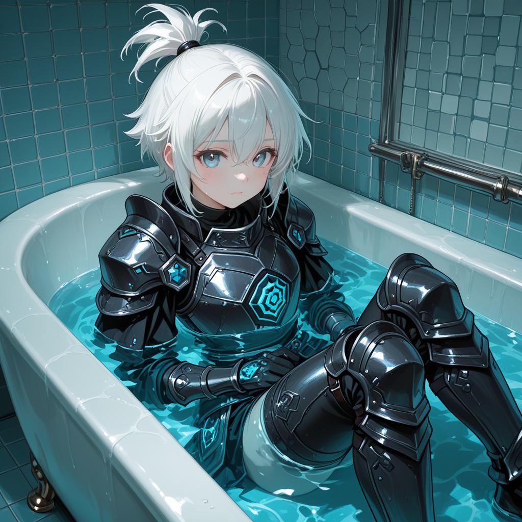 (1girl, white hair very short hair split ponytail, hexagon eyes, scared) (digital) (, in detailed poolside, (cum, bathtub, armor)), best quality