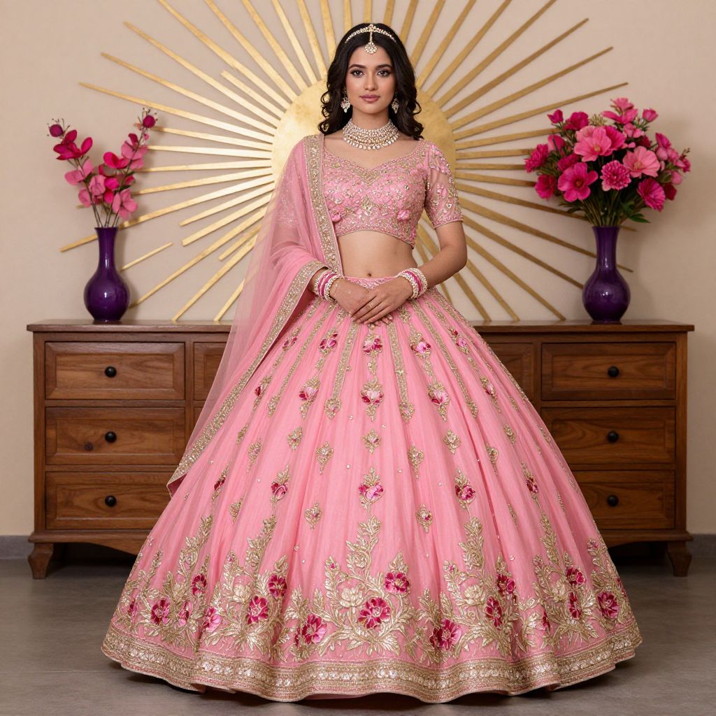 Elegantly poised in a vibrant pink Bollywood-inspired quinceañera gown adorned with intricate floral embroidery and gold embellishments, a young woman stands gracefully against a sunburst-patterned backdrop, flanked by a wooden dresser topped with a purple vase and a bouquet of vivid pink flowers.