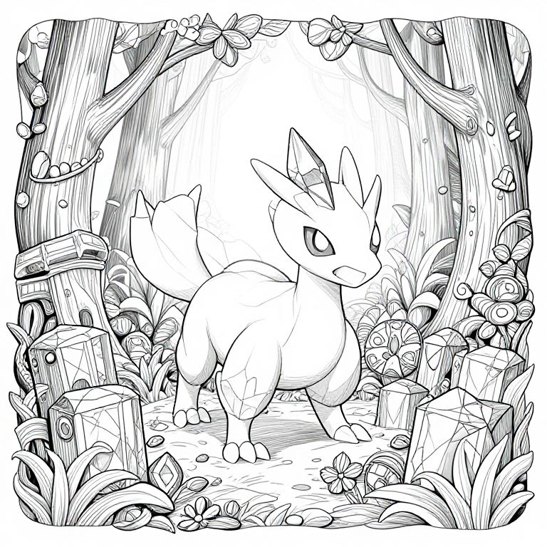 Crystal a fire pokemon coloring sheet in zentangle style in a forrest full of hidden treasure, just black and white color, no gray color, vectoriz illustrator, 8k,