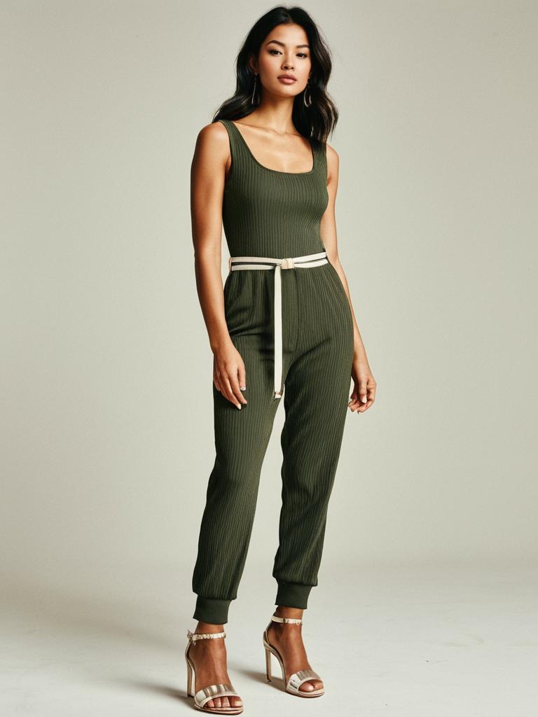 Woman, athletic leisure, fitted ribbed jumpsuit in olive green, sleeveless, scoop neckline, full-length pants, clear strap high-heeled sandals, no visible jewelry, studio background with neutral tones