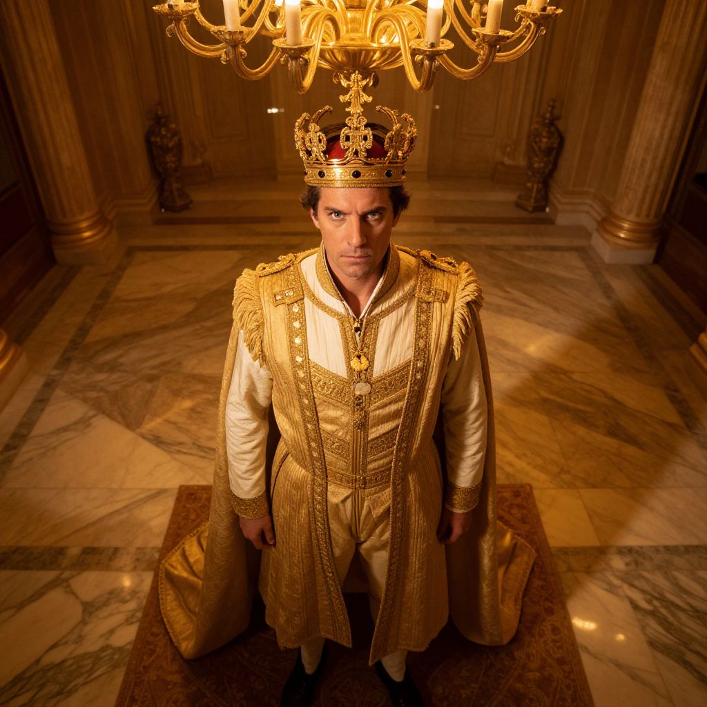 Photograph of a serious-looking man standing in an opulent, marble-floored room with tall, golden columns. He wears an elaborate, gold-embroidered, long-sleeve robe and a detailed, gold crown with red gems. A grand, ornate chandelier with multiple light bulbs hangs above him, casting a warm, golden glow. The man's dark hair peeks out from under the crown, and his arms rest by his sides. The background includes two statues flanking the room's entrance. The overall scene conveys a regal, majestic atmosphere.