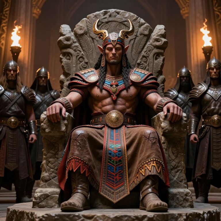Photorealistic digital art of a muscular, dark-skinned warrior king with horns, sitting on an ornate stone throne, flanked by guards with